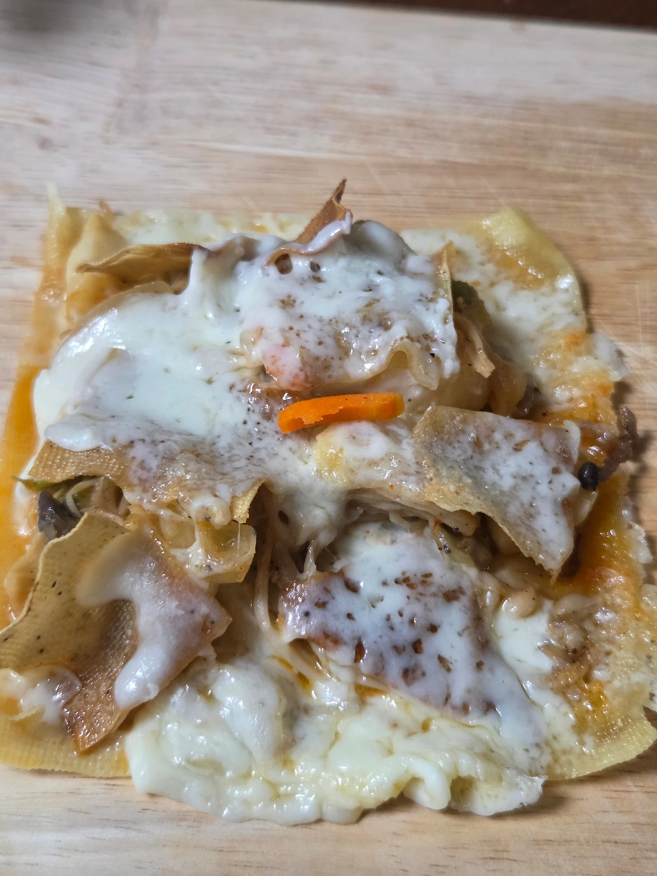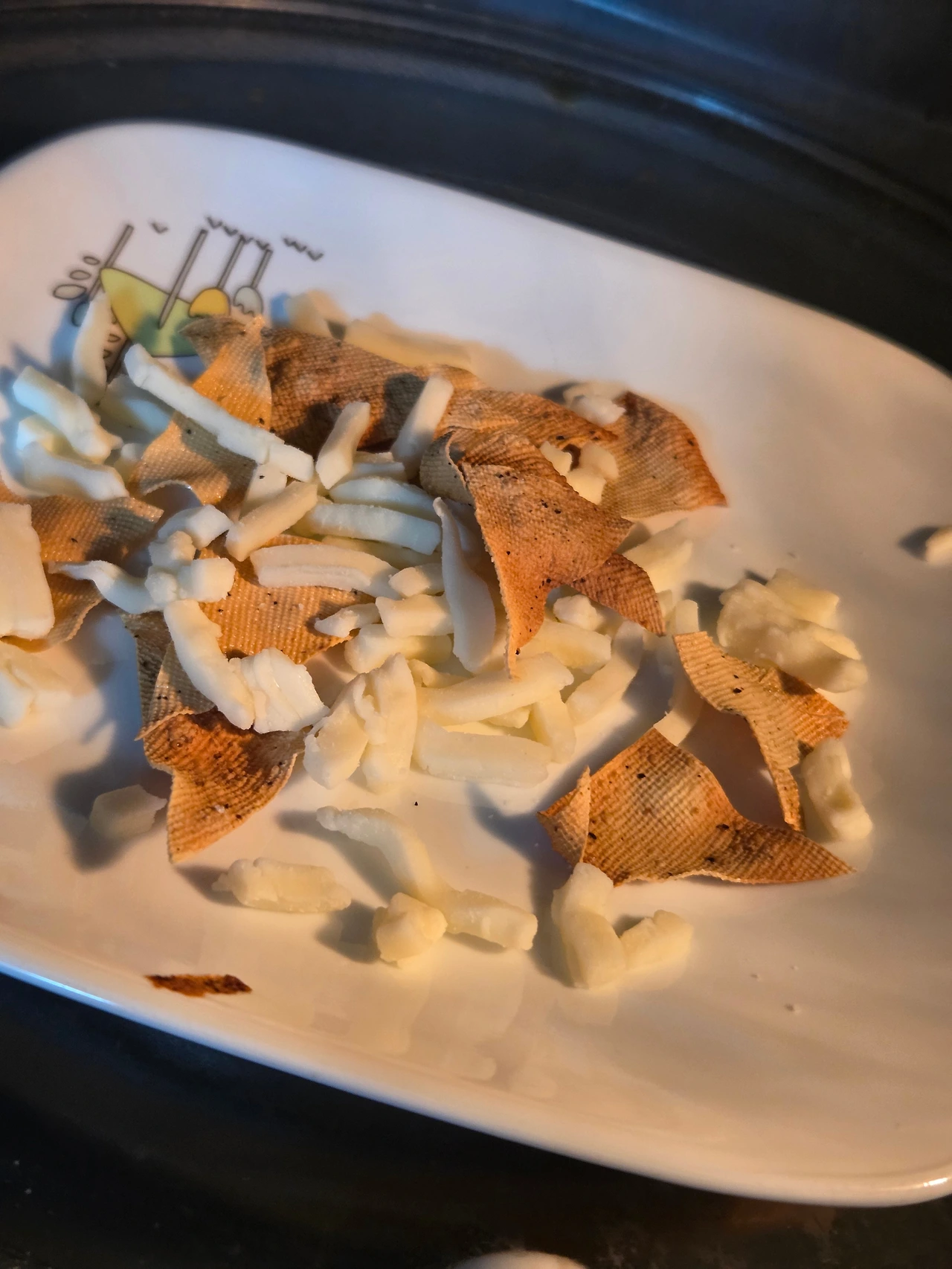 점심에 먹고 남은 것을 두부포 위에 살짝 올려서, 두부칩과 치즈를 얹어 데우는 것이다.