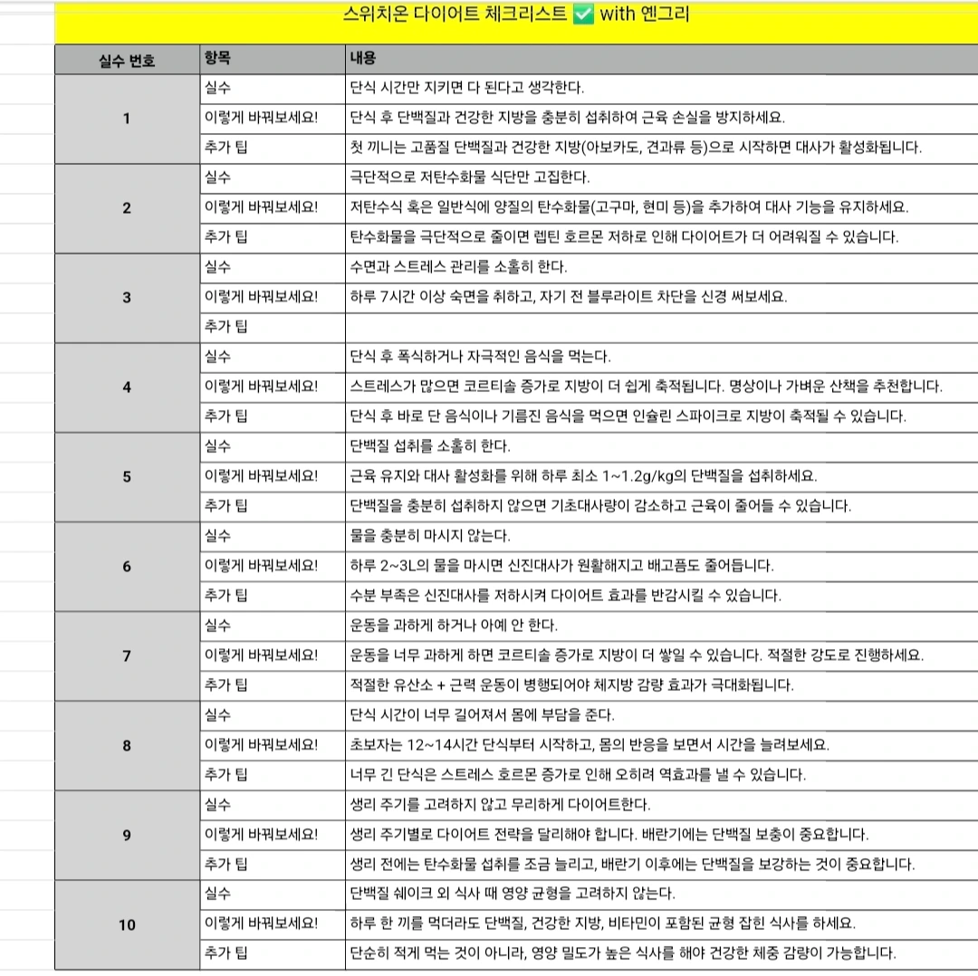 아래는 유튜브에 스위치온 다이어트 2주 차 후기를 보다가 얻게 된 체크리스트다.