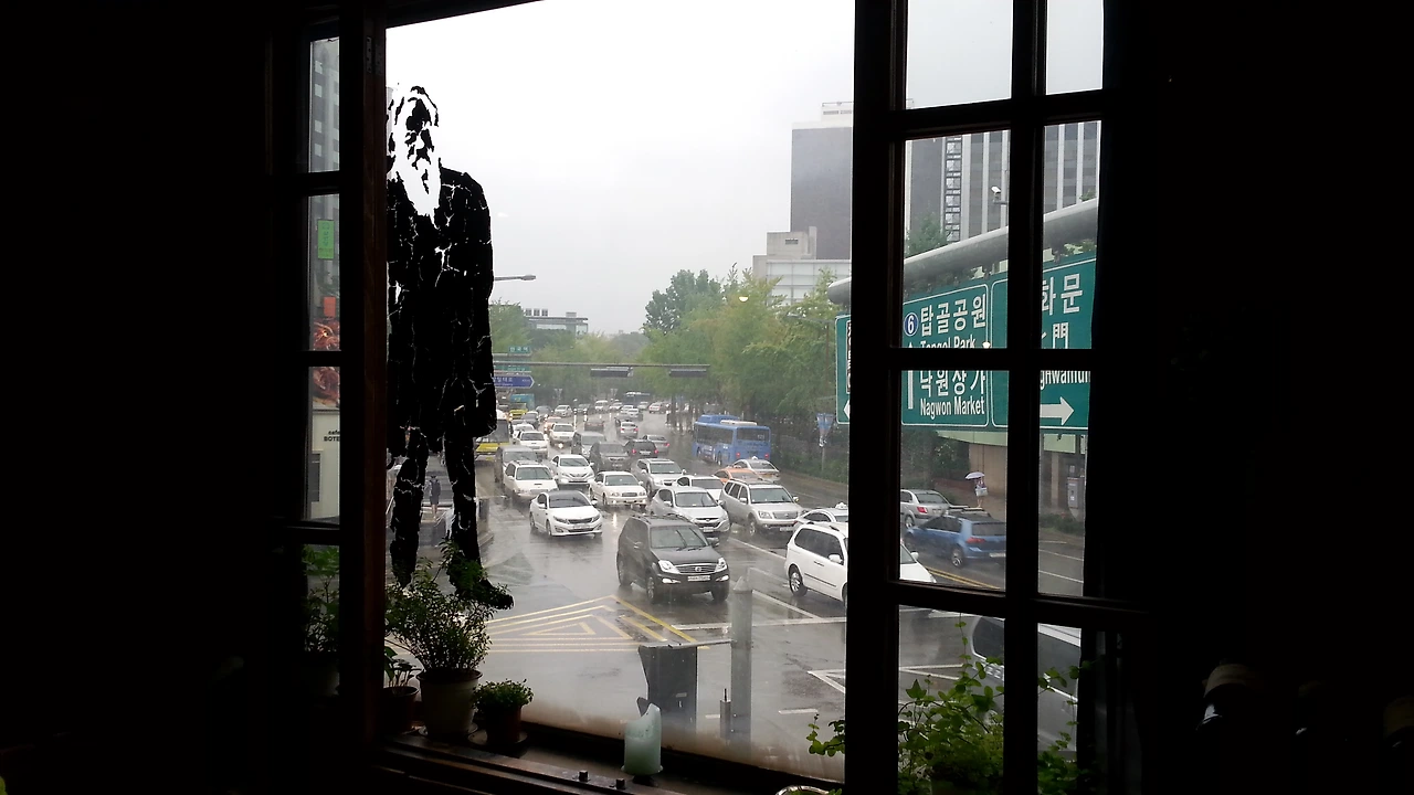 내가 좋아하는 격자 무늬의 나무 창틀 너머로 안국역 사거리의 풍경이 시원하게 들어 온다.