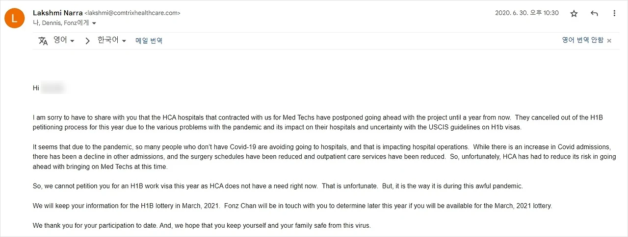 시급이 적어도, 최대한 빨리 미국에서 일을 시작해야 했고, 영주권을 받는 가장 빠른 길이라 생각하여서 바로 진행하였다. 정말 운이 좋게도 H1b Lottery를 바로 통과하였다. 플로리다 주의 면허이전을 준비하였고, 필수교육과정인 AIDS, STD관련 인터넷 교육을 진행하면서 한 단계씩 미국에 가까워지고 있다고 생각하였다. 그러나 정말 갑작스럽게 2020년 6월 코로나로 인해 병원에서 사람을 더 이상 받지 않는다고 하였고, 어느새 별이야기도 없이 에이전시의 메일하나에 모든 과정들이 중단되었다. 몇 번이나 메일을 보냈지만, 어쩔 수 없다는 말과 내년에 다시 준비해보자는 말만 들었다. 그렇게 또 나의 1년이 지나갔다.