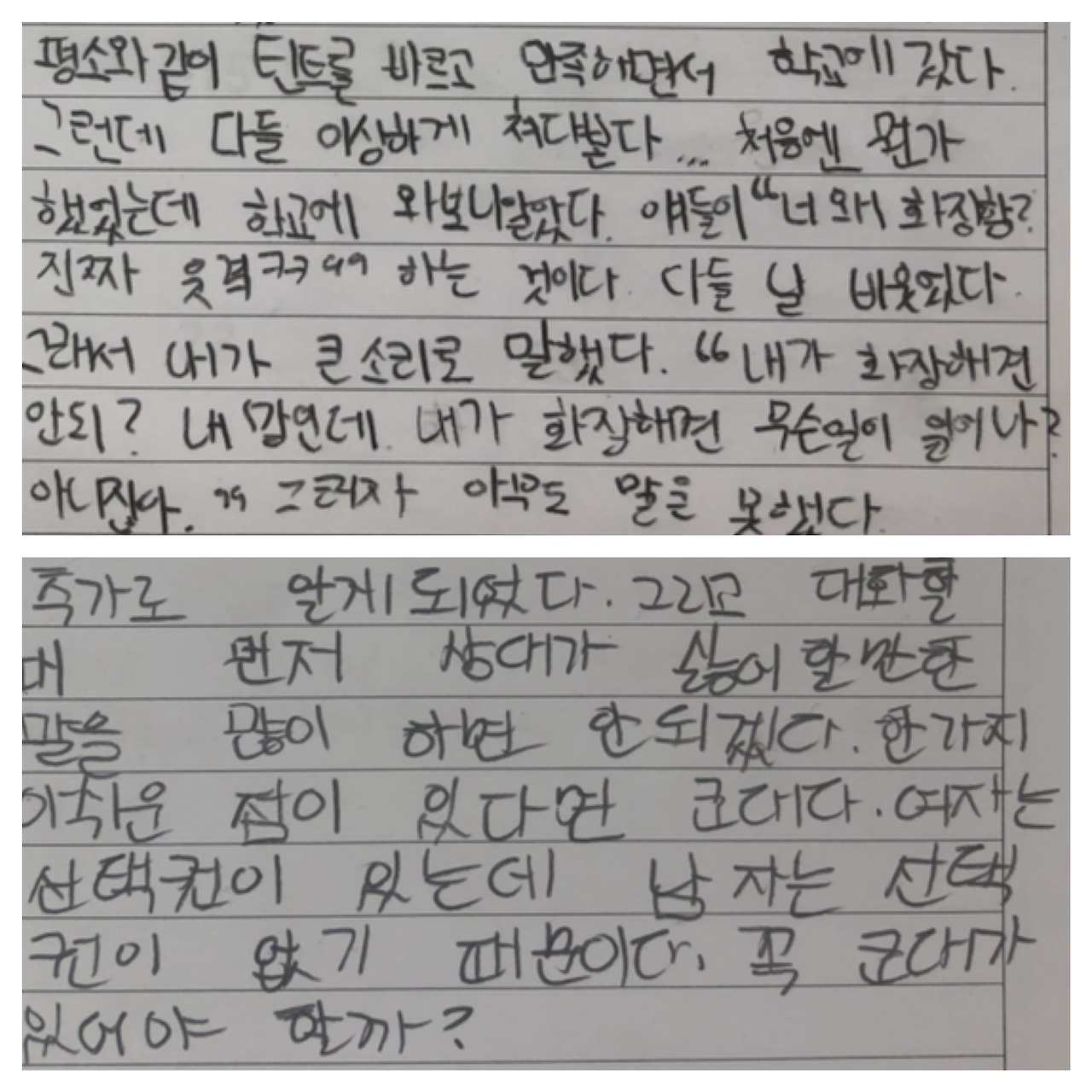 이제 본래 자신의 성별 칸으로 돌아가서, 친구들이 적어놓은 걸 볼 차례다. 너나없이 깔깔댄다. 기막힌다는 표정을 짓기도 한다. 자신에겐 너무 당연한 일상이 상대에겐 무척 생소하고 의아한 일일 수 있음을 확인한다. 그렇게 서로의 처지가 다르다는 걸 이해하고, 상대의 눈으로 나를 다시 보기도 하는 시간이다.