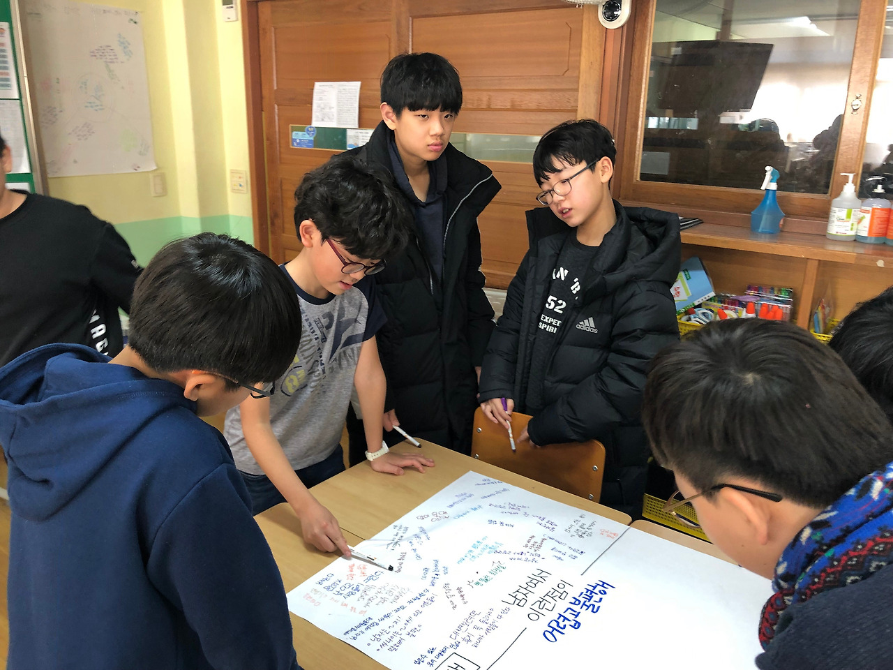 같은 성별 친구들끼리 모여 적을거리를 떠올리는 동안 그간 해본 적 없던 이야기들이 쏟아져 나온다. “우리 엄마가 그러는데 진-짜 아프대.(남학생)”, “헐, 그럼 남자는 소변 본 다음에 안 닦아?(여학생)”하며 활달하게 이야기 나눈다. 어떤 것들은 오해였지만, 우선은 자유롭게 얘기하도록 뒀다. 그래야 서로가 오해한 지점을 찾고, 이해할 틈을 만들어낼 수 있을 테니까.
