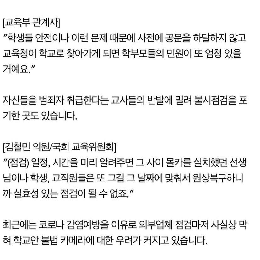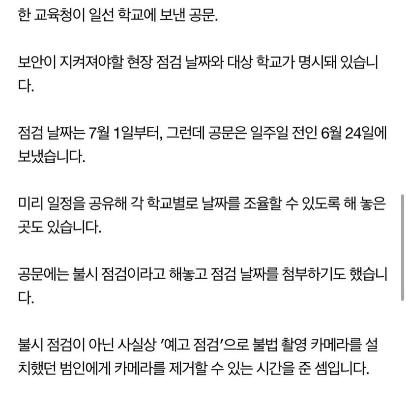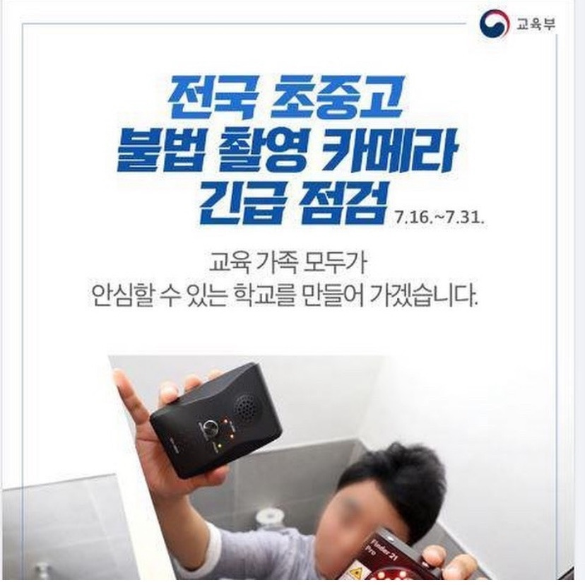 작년에 학교 불촬카메라 사건 연달아 3건 발생한 뒤 교육부가 세운 대책은 기가 막혔다. 16일부터 31일까지 전수조사하겠다고 ‘공문’을 내려보냈다. 15일 페북, 트위터엔 멋지게 홍보까지 했다. 설치한 카메라 치우라고 광고하는 꼴. 이 정도 민감성 갖고 일하는 교육부, 갈 길 짱 멀었다. 주기적으로 성인지감수성 교육 받고 성인권 정책관 확대도입하라고 해야 한다.
