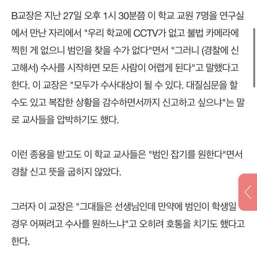 “일 크게 만들지 마라, 녹화된 게 없었다, 학교에 추가 카메라도 없었다, 피해자가 없는데 복잡한 상황 감수하면서까지 신고할 거냐. 전부 조사해야 하는데 감당할 수 있겠냐. 그대들은 교사인데 범인이 학생이면 어쩌려고 그러느냐!”