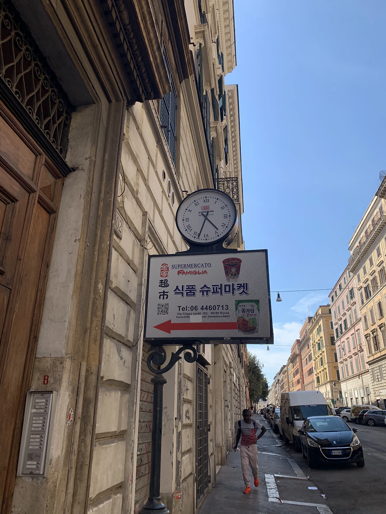 아직 해가 떠있었지만 오늘 계획했던 일정이 모두 끝난 우린 숙소로 일찍 돌아가 쉬기로 했다. 지친 발걸음으로 걸어가는데 뜬금없이 한인마켓 간판이 튀어나왔다. 앞서 거쳐온 도시들에서는 아무리 돌아다녀도 본 적이 없었는데. 이게 뭐라고 오랜만에 보는 한국어가 그렇게 반가울 수 없었다. 로마에서 내가 읽을 수 있는 표지판이 있다니! 하마터면 배운 적 없는 이탈리아어에 천부적인 소질이 있다고 믿을 뻔했다.