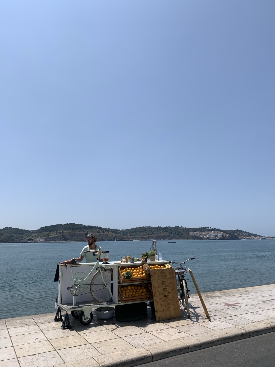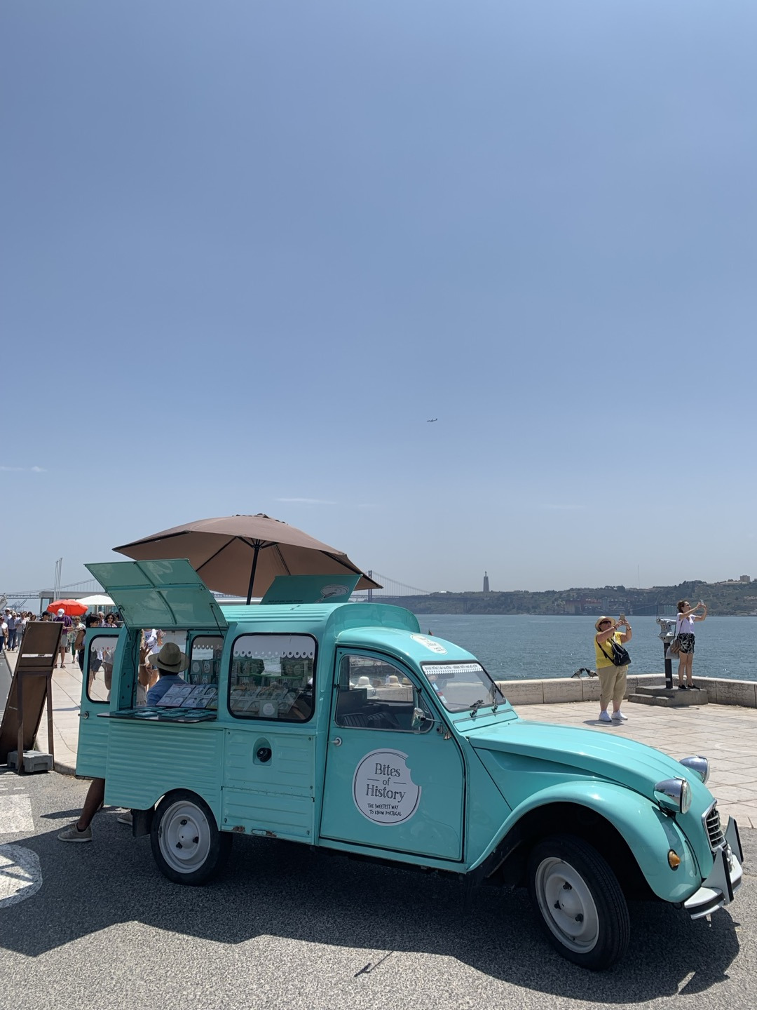 벨렘탑에서 발견기념비까지 걸어가는 길 앞엔 바다라고 착각할 정도의 너른 테주강이 시원스레 펼쳐졌다. 그런 풍경을 병풍 삼아 핫핑크, 민트 등 화려한 색깔로 이목을 끄는 클래식 차들이 집합해 있었는데 착즙오렌지부터 라임에이드, 피나콜라다까지 보기만 해도 상큼한 음료들이 줄지어 여행자들을 맞았다. 더운 날씨에 딱 맞는 메뉴 선택이 목마른 사람들을 사이렌처럼 끊임없이 불러들였다.