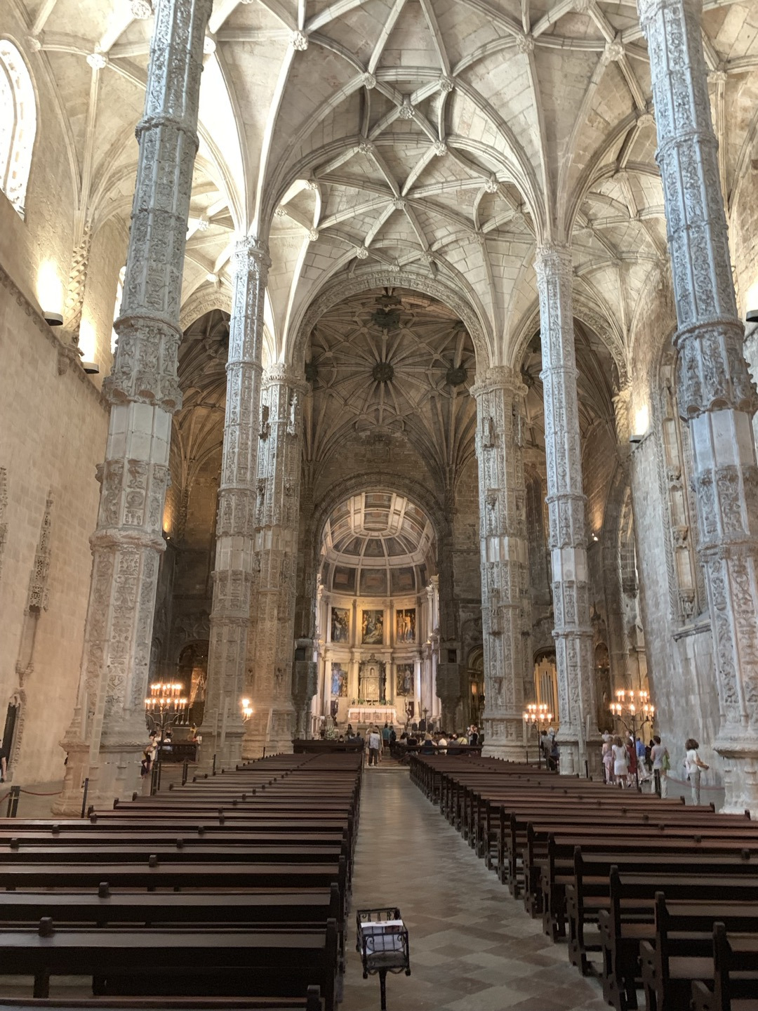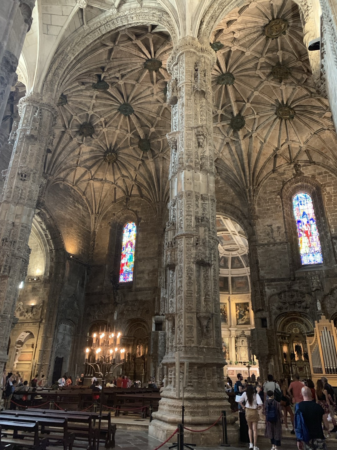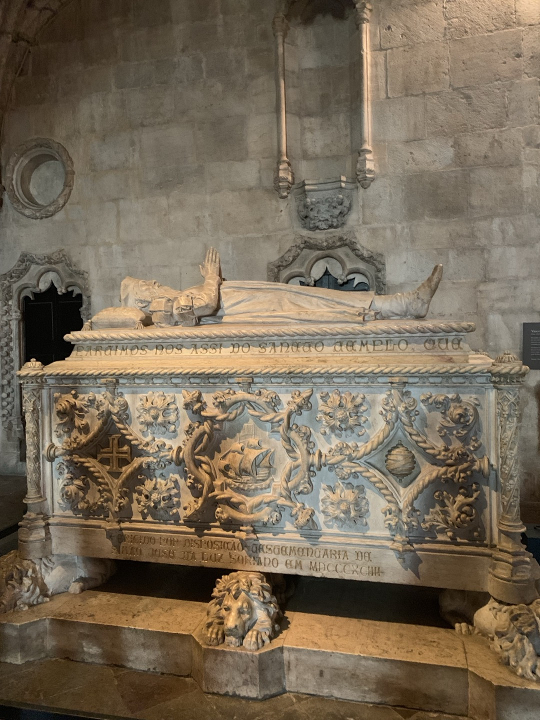 외관을 볼 때도 그랬지만 내부를 둘러보는데 여태까지 봐왔던 건축양식과는 사뭇 다른 느낌이 들었다. 실이 복잡하게 얽혀있는 듯한 촘촘한 천장 장식, 성난 파도를 닮은 새파란 타일, 묘하게 이국적인 향기가 느껴지는 조각들. 알고 보니 제로니무스 수도원은 포르투갈만의 독특한 건축양식인 마누엘 양식의 정수를 보여주는 대표적인 건축물이었다. 고딕 양식을 기본으로, 이탈리아·스페인·플랑드르 등 다양한 유럽 양식이 조화를 이루면서 닻, 밧줄, 산호, 조개 등 해양 탐험 시대의 상징물이 조각되어 있는 게 특징이다. 자세히 보니 포르투갈의 대표 탐험가 바스코 다 가마의 관에는 조개와 범선, 밧줄 등의 해양 문양이 새겨져 있었고, 산타 마리아 성당의 기둥과 천장은 기후가 따뜻한 리스본에서 자주 볼 수 있는 야자수를 형상화한 것이었다. 숨은 그림 찾기를 하듯 곳곳에 숨어있는 해초와 조개를 하나씩 찾아보는 재미가 쏠쏠했다.