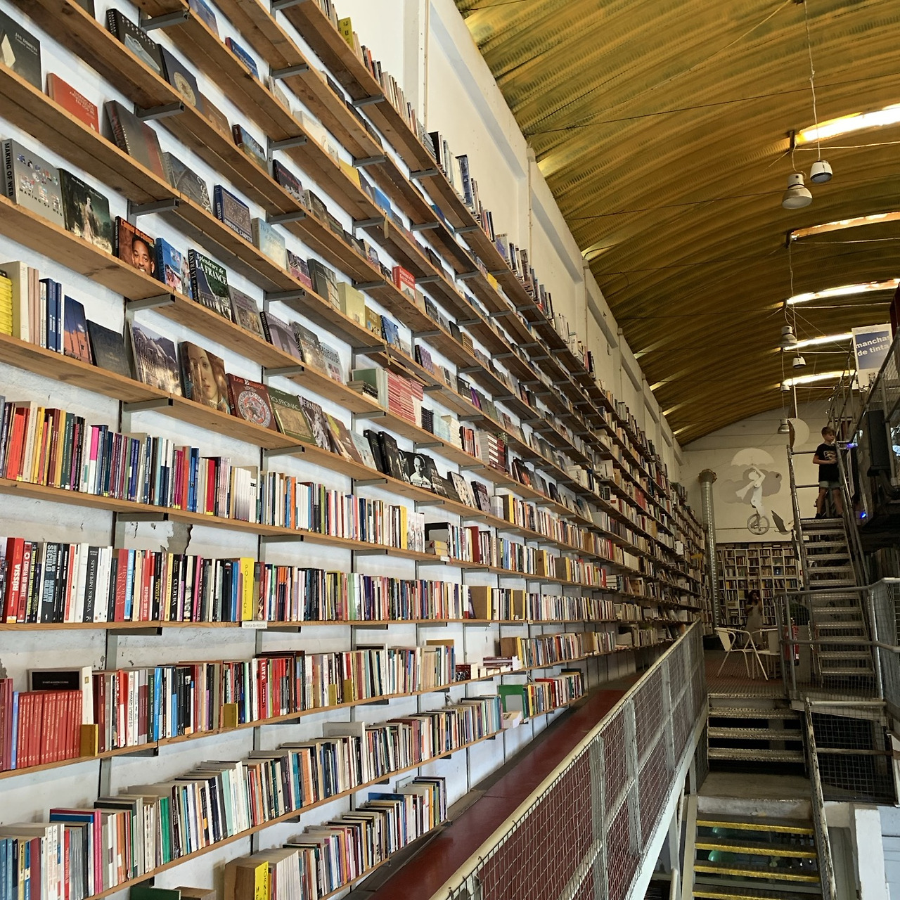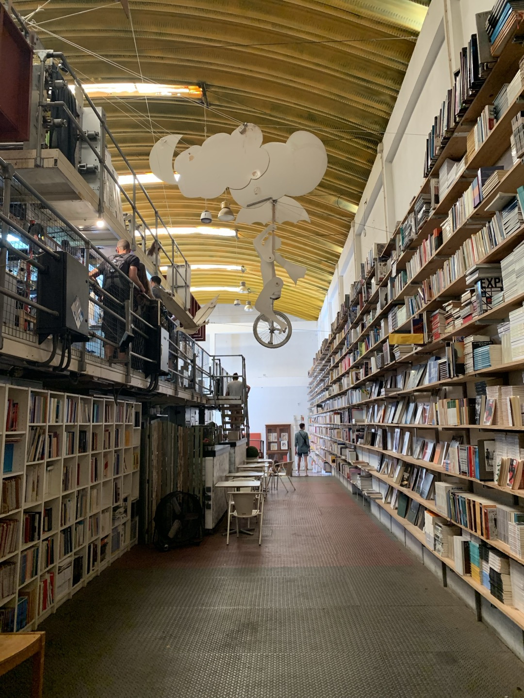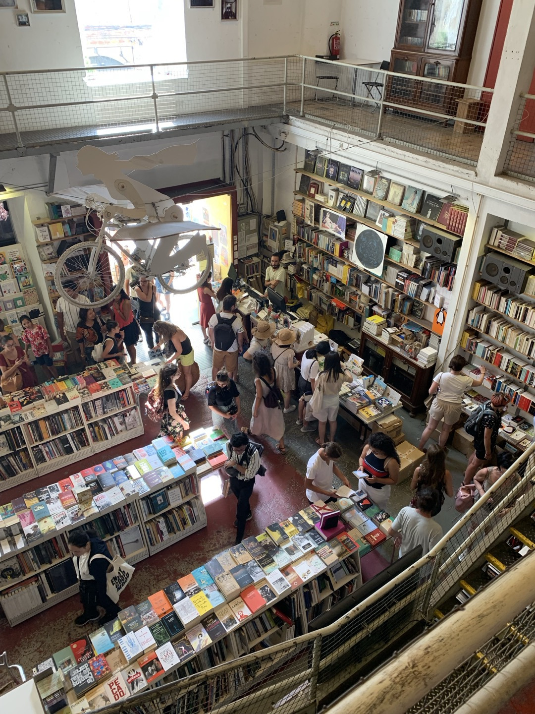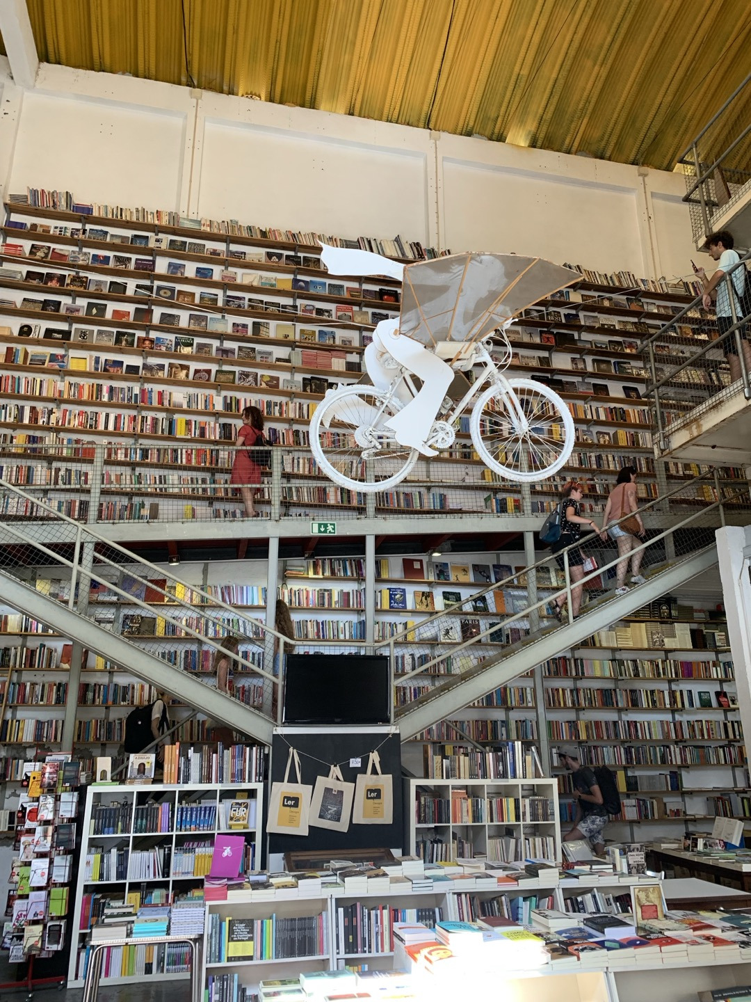 한참 걷다가 햇살을 피해 눈에 띄는 아무 서점으로 들어갔다. 안에 들어서자, 높은 층고와 압도적인 높이의 책장이 두 눈 가득 덮쳤다. 중앙에는 자전거 타는 새하얀 사람모빌이 천장을 가로지르며 매달려 있었는데, 알고 보니 이곳이 그 유명한 서점 <Ler Devagar>였다. 여행책자에서 리스본을 대표하는 서점으로 소개된 걸 봤었는데 발길 닿는 대로 오다 보니 마주하게 된 이 우연이 그저 신기할 따름이었다. 예전에 방직공장이었던 장소답게 바닥과 계단, 손잡이가 모두 철제로 되어있어서 걸음을 옮길 때마다 철컥, 하는 쇠마찰음 소리가 났다. 대체로 서점이란 공간을 떠올렸을 땐 포근하고 따뜻하다는 감각이 제일 먼저 스미는데, 여긴 공기에서도 소리에서도 서늘한 냉감이 느껴져서 독특했다.