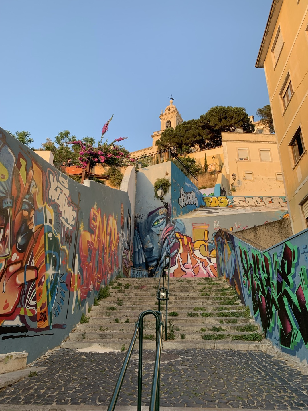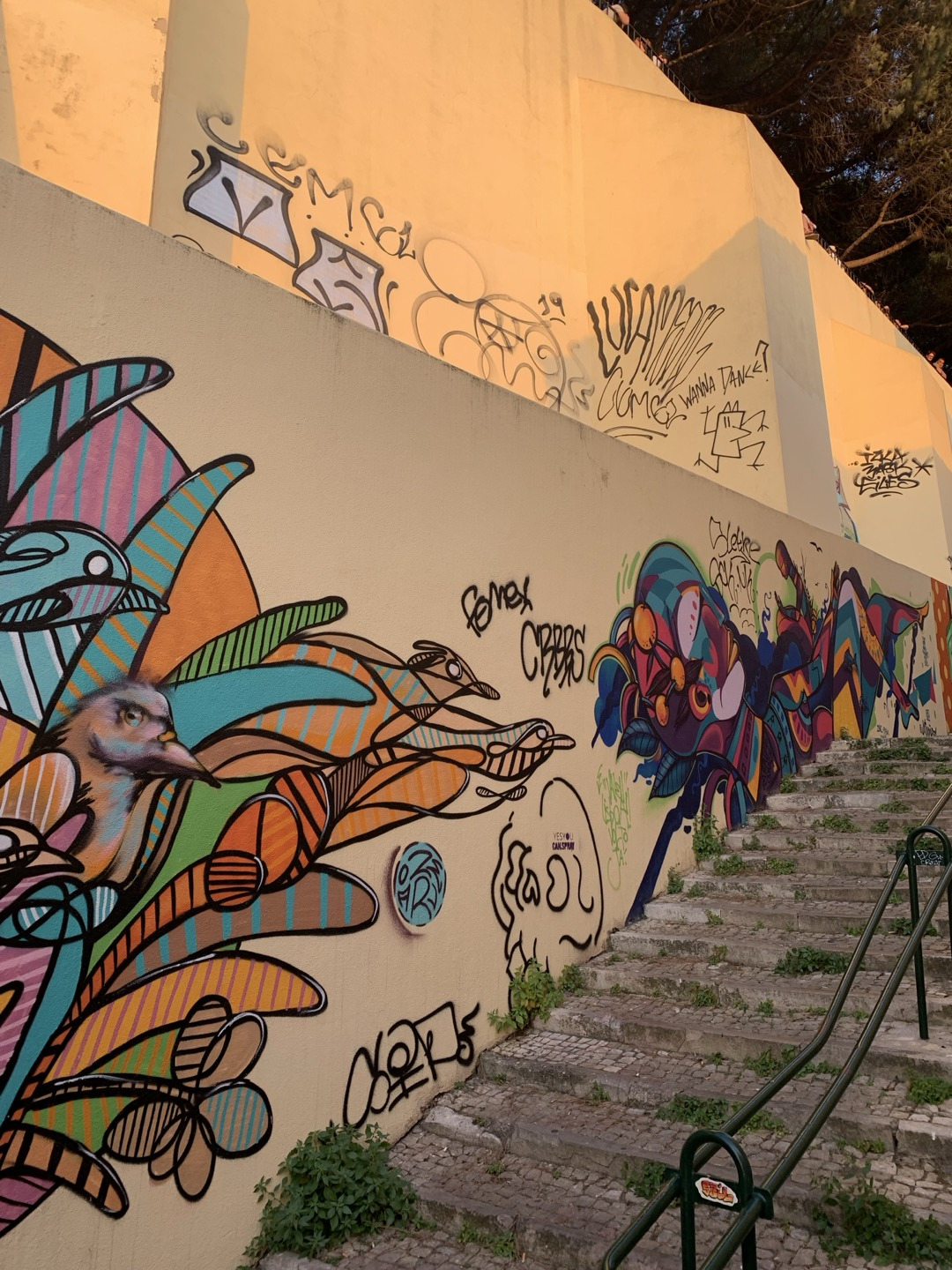 끝없이 펼쳐진 계단에 엄마와 나는 연거푸 물었고, 구글 지도를 손에 든 오빠는 맞다는 의미로 연거푸 고개를 끄덕였다. 그나마 위안이 되는 건, 야외미술관을 방불케 할 만큼 다채로운 벽화가 많아 감탄을 하다 보면 다리에 가해지는 압박감을 자꾸 잊게 된다는 것이었다. 중간중간 건물 사이로 보이는 예쁜 풍경도 기운을 북돋는데 한몫했고. 역시 리스본의 예술가들은 다 계획이 있었다! 다시 힘을 내서 100m 달리기를 할 때처럼 짧고 굵게 끝낸다는 마음으로 전력을 다해 올라갔다.