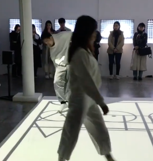 모쪼록, 뒤러가 <측정의 교육>에서 소개한 안티크바와 프락투어 양식의 알파벳은 각기 13개인데, 유장우 작가는 이 책에서 설명한 알파벳들을 바탕으로 서로 대응하는 철자를 바닥에 투사하고 퍼포머들에게 각기 서로 다른 타이포그래피 도식에 따라 움직일 것을 요구했습니다. 가령, 퍼포먼스 2명이 있을 경우, 한 명은 안티크바 양식으로 적힌 철자 A를 따라 움직이고, 나머지 한 명은 프락투어 양식으로 적힌 철자 A를 따라 움직인다는 것입니다. 이처럼 작가는 역사적 사실에 대한 풍부하고도 체계적인 리서치를 바탕으로 자신이 탐구하는 소재인 ‘몸짓’을 타이포그래피 논쟁에 연결시켜 몸짓의 사회적 의미를 시공간적으로 확장시켰습니다.