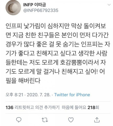 INFP에게 사회생활은 나에 대해 생각해보게 하는 일들 투성이다. 그래도 다양한 사람들의 특성과 그 안에서의 역학을 보는 건 여전히 흥미로운 일이며, 그 안에서 결이 맞는 사람을 만날 때의 즐거움은 이루 말할 수 없다는 점을 위안으로 삼아본다.