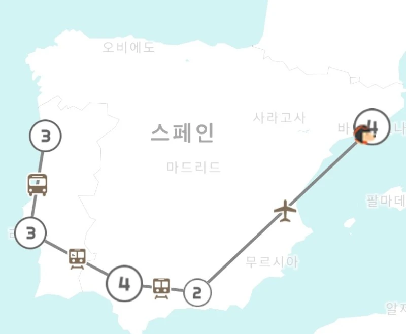 17일 동안의 여행코스는 포르투(in)-리스본-세비야-그라나다-바르셀로나(out)로 2개국 5개 도시 여행을 계획하였다. (원래는 신트라를 포함해서 2개국 6개 도시를 계획했으나 사정이 생겨 가지 못했다.)