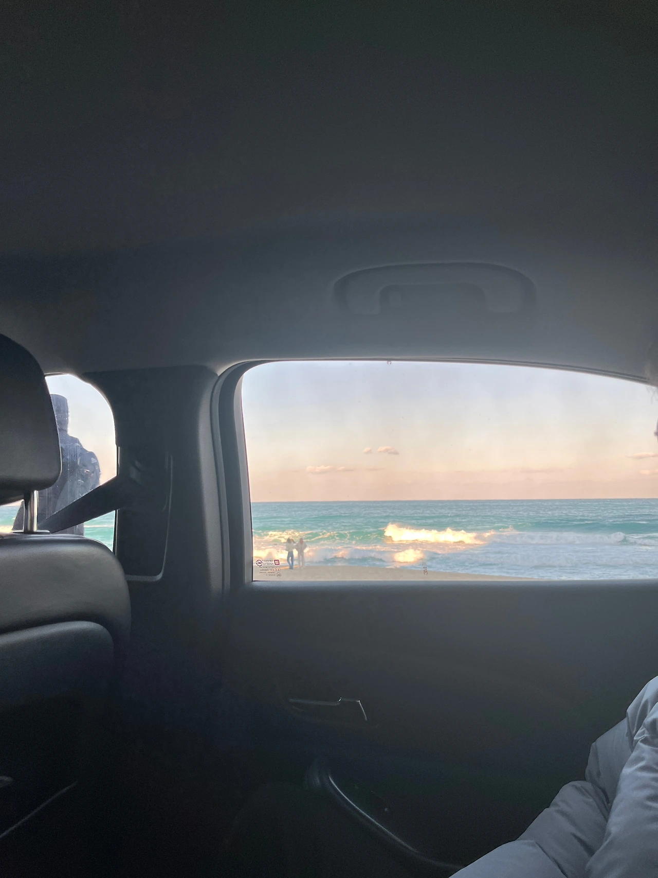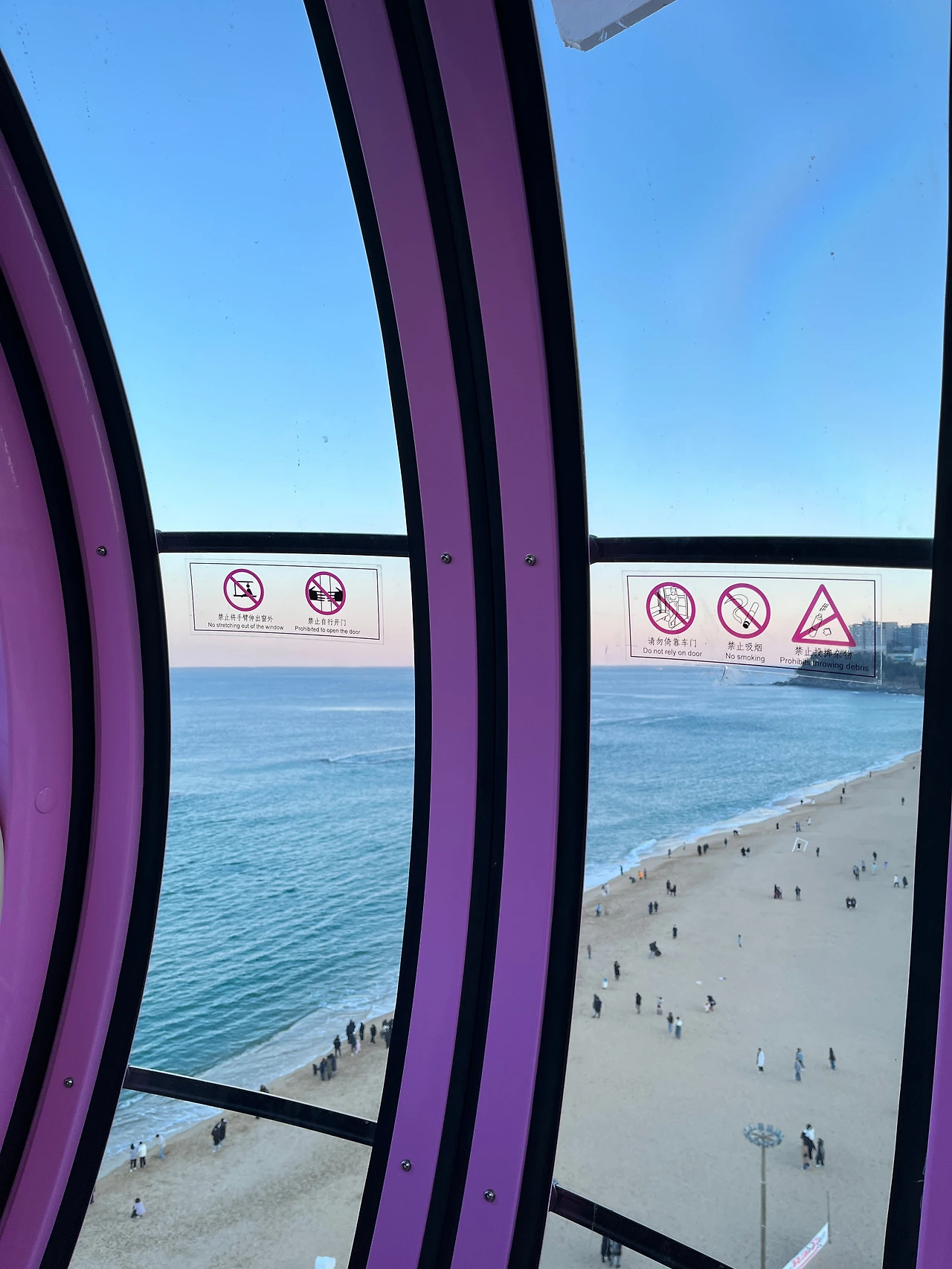 일몰시간에 맞추어 타려고 했건만, 아쉽게도 예상보다 일찍 탑승하게 되었다. 그럼에도 예뻤다. 속초해변의 핑크색 하늘과 그에 맞춘 핑크색 탑승차. 찰떡이군.