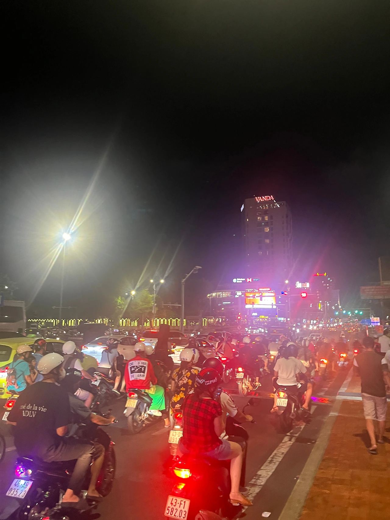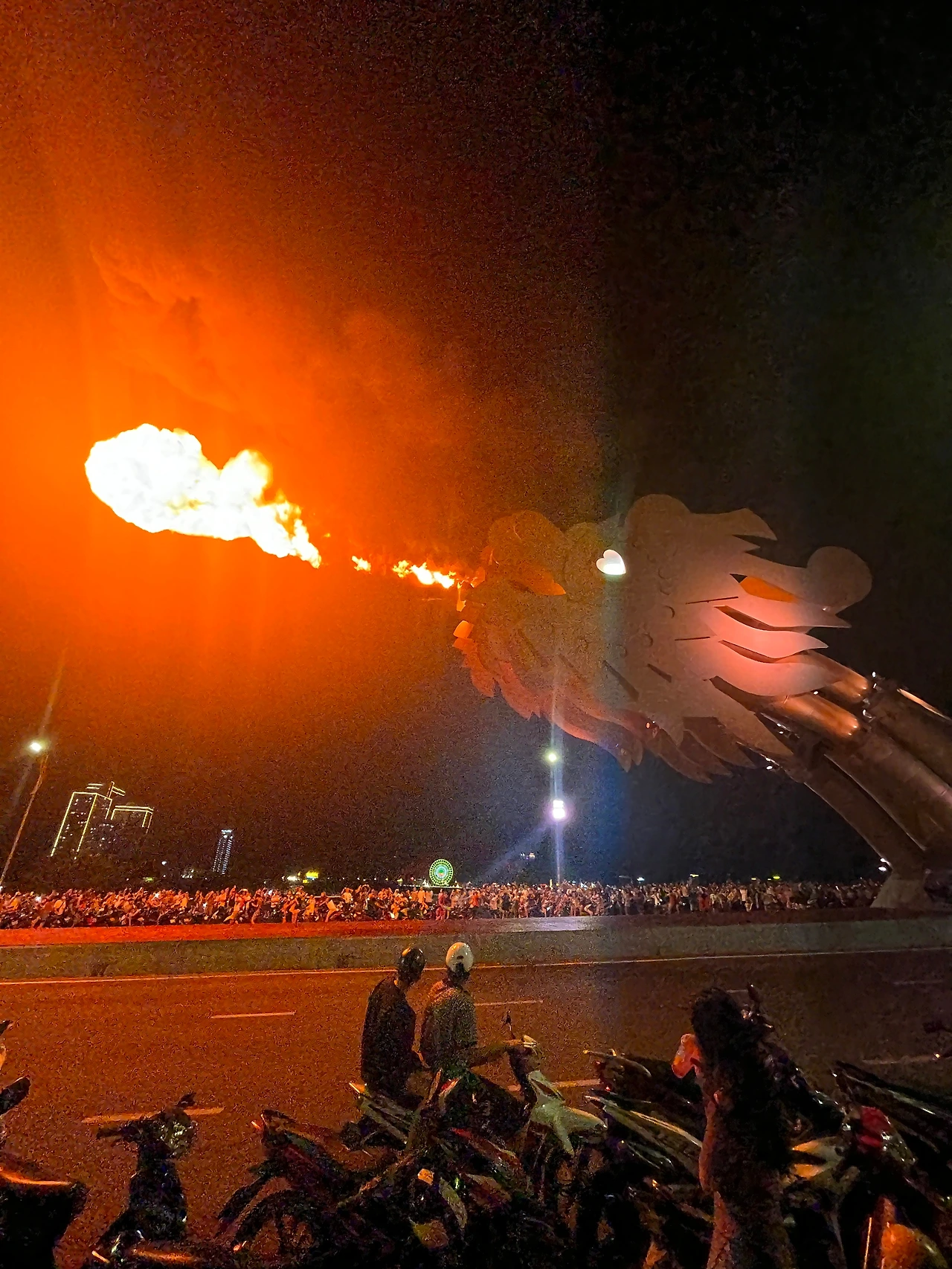 10분간의 물불쇼가 끝나고, 다리 위의 통제가 풀렸다. 베트남 와서 확실히 이곳이 베트남이구나를 느꼈던 요소는 오토바이였다. 베트남 인구의 7,80%가 애용하는 교통수단인 만큼 오토바이는 생계수단 그 자체이다. 2~3명 타는 건 기본인데 정작 제대로 된 교통신호는 없는 것이 신기하다. 그들 나름의 절차와 방식으로 규칙을 만들어낸 느낌이다. 그래도 하이바는 꼭 쓰더라! (아마 법으로 정해져 있지 않나 싶다.)