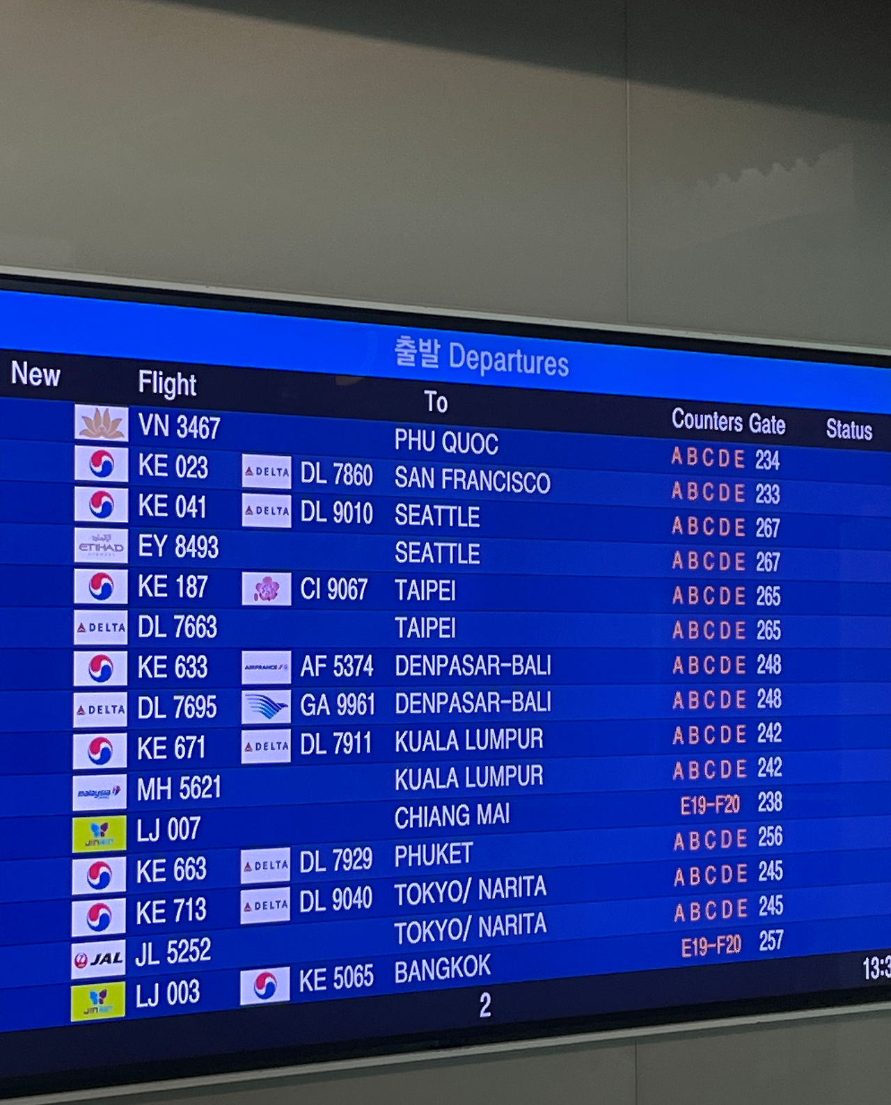 고등학교 제주도 수학여행 이후로 두 번째로 타는 대한항공. 최근 아시아나항공과의 합병을 앞두고 있는데 미국의 승인만 남겨두고 있다. (개인적인 소비자의 바람에서는 합병되지 않았으면...)