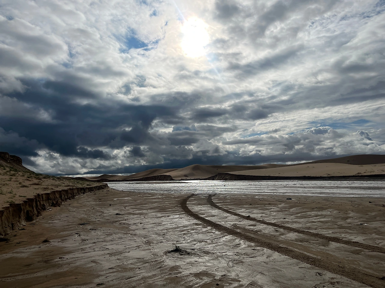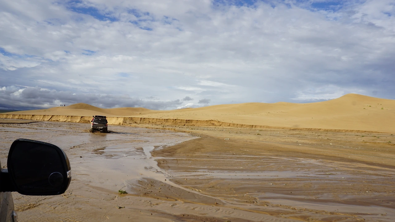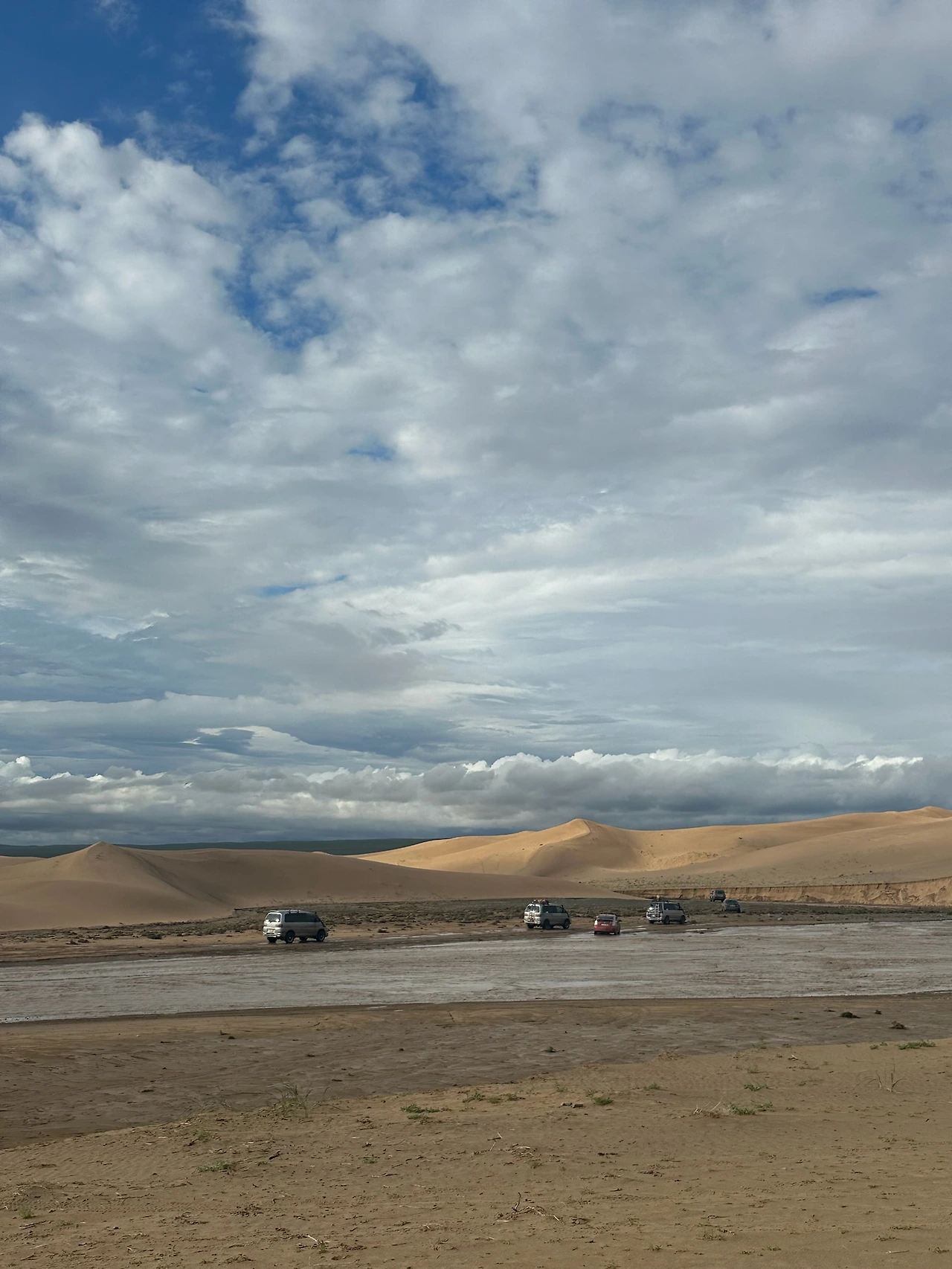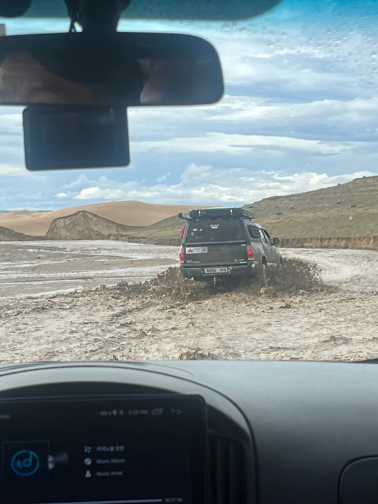 한 3시간이 지났을까. 비가 그치기 시작했고, 다행히 사막의 건조기후 덕분? 에 강이 점점 마르기 시작했다. 때마침 우리 투어사에서 추가 차량을 지원해 주었고, 추가 차량이 앞장서서 남겨주는 바퀴자국을 따라 강을 건너기 시작했다. 다른 여행사 차량도 하나둘씩 고비로 이동하기 시작.