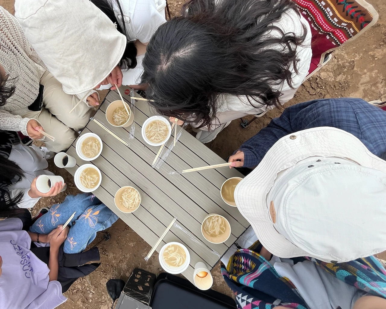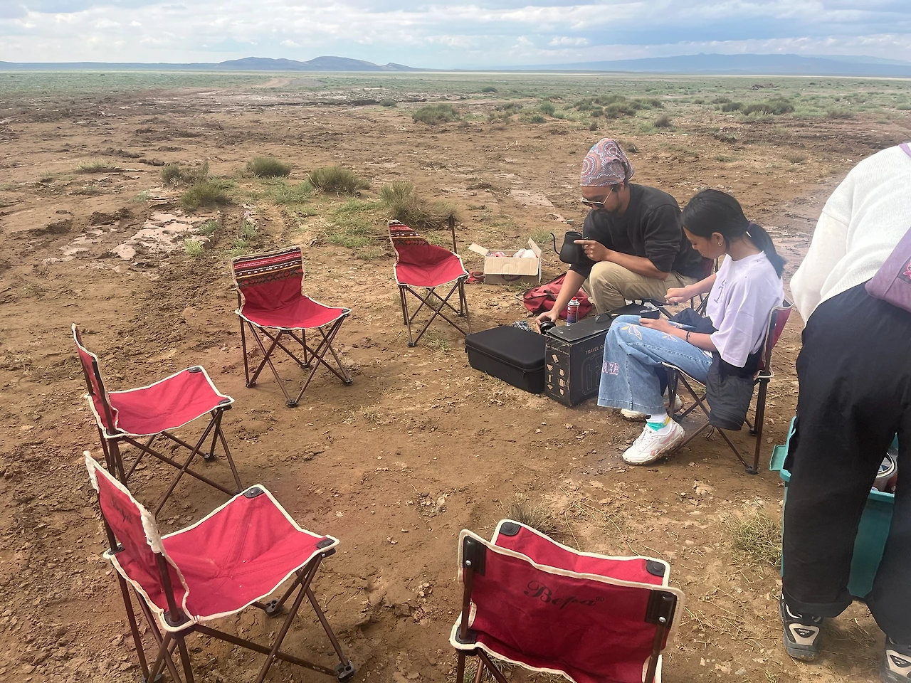 그러다 투어사 관계자분이 갑자기 캠핑 의자와 도구들을 한쪽에 주섬주섬 꺼내기 시작했다. 그냥 지나가는 다른 투어사 스타렉스에게 도움을 요청한다는 전략으로 기다리는 동안, 원두커피를 대접해 주시고, 칼국수도 끓여 주심. 그냥 이 모든 상황이 웃프기도 하면서 또 우리가 언제 이런 경험을 해보겠냐며 멘탈을 잡았다. 여행 중에 가장 많이 했던 말: 오히려 좋아, 럭키비키자나~