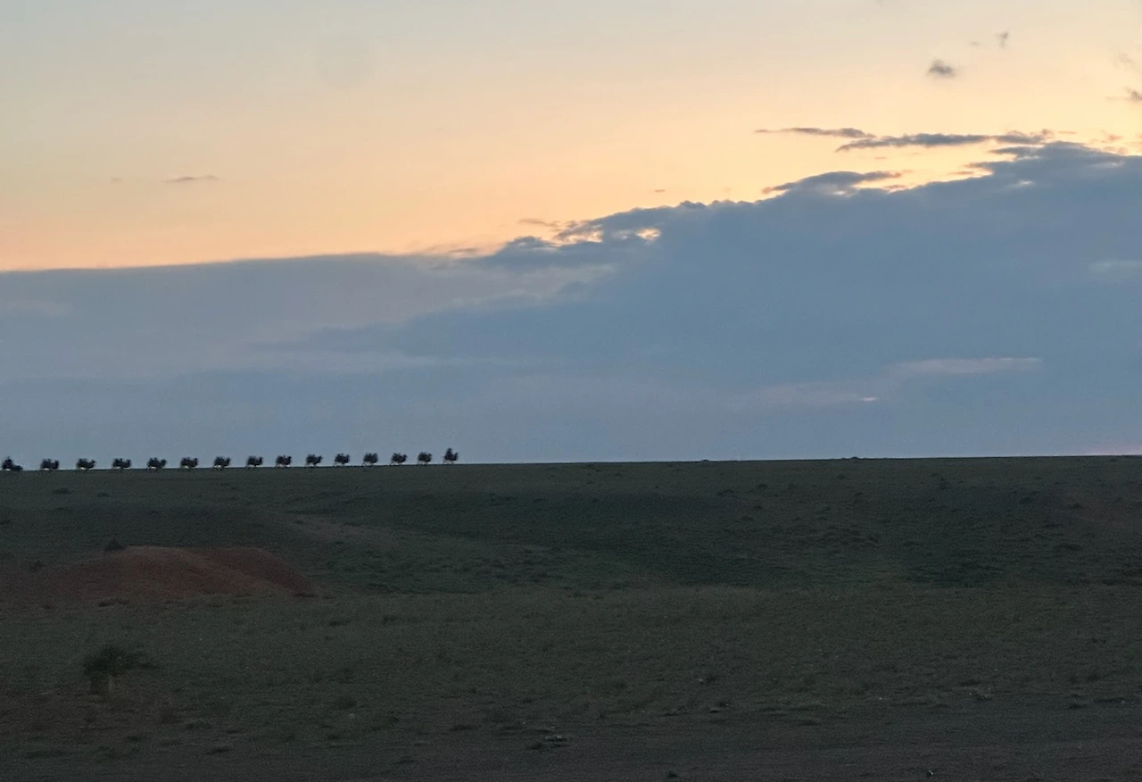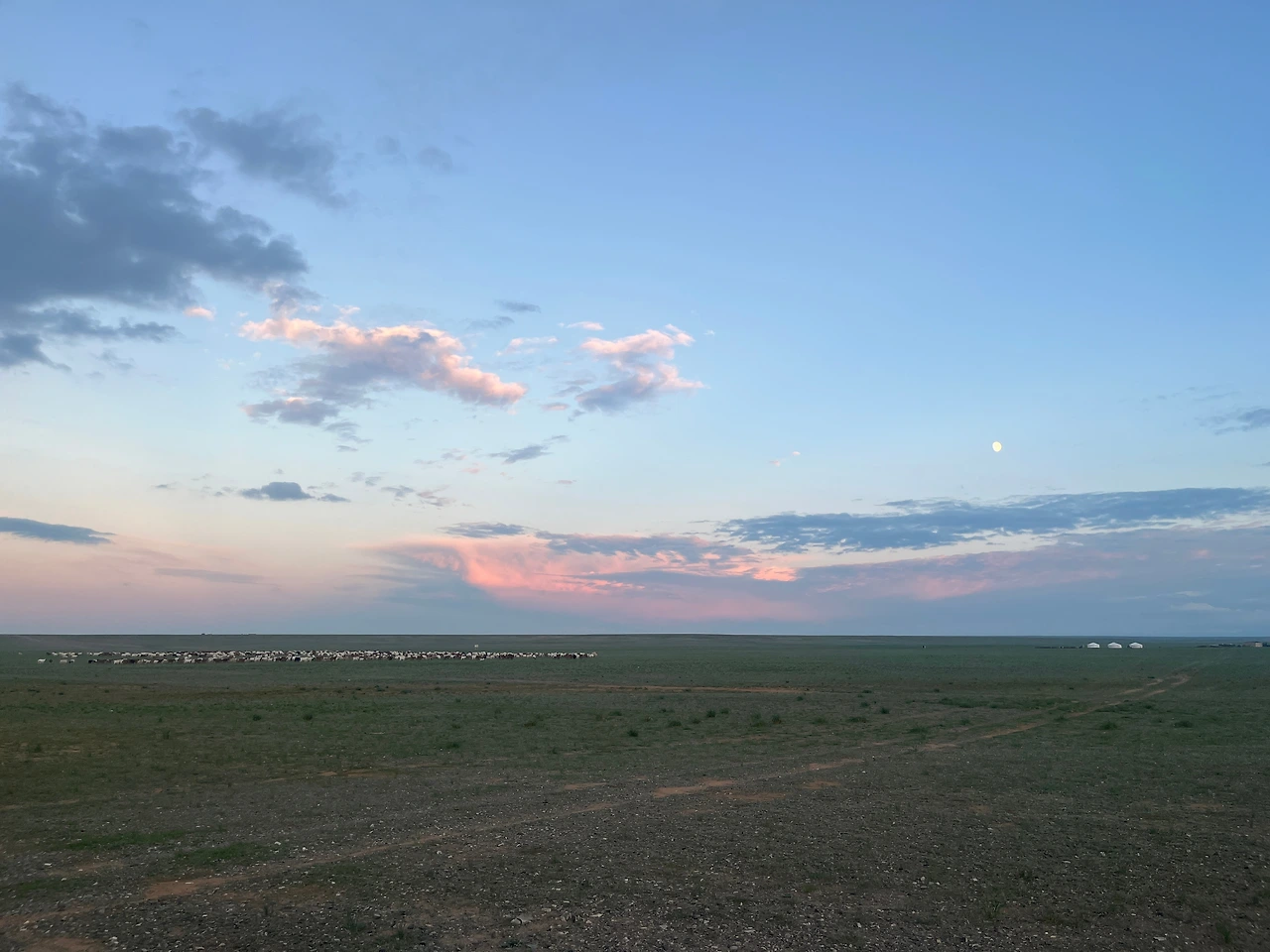 어느덧 오늘의 목적지 바양작에 이르렀다. 몽골의 여름은 해가 엄청 길기 때문에 해와 달이 한 번에 보이기도 한다. 핑크색과 연한 보라색의 하늘과 아무것도 눈에 거슬리지 않는 넓은 평야가 가슴을 뻥 뚫리게 만들었다.