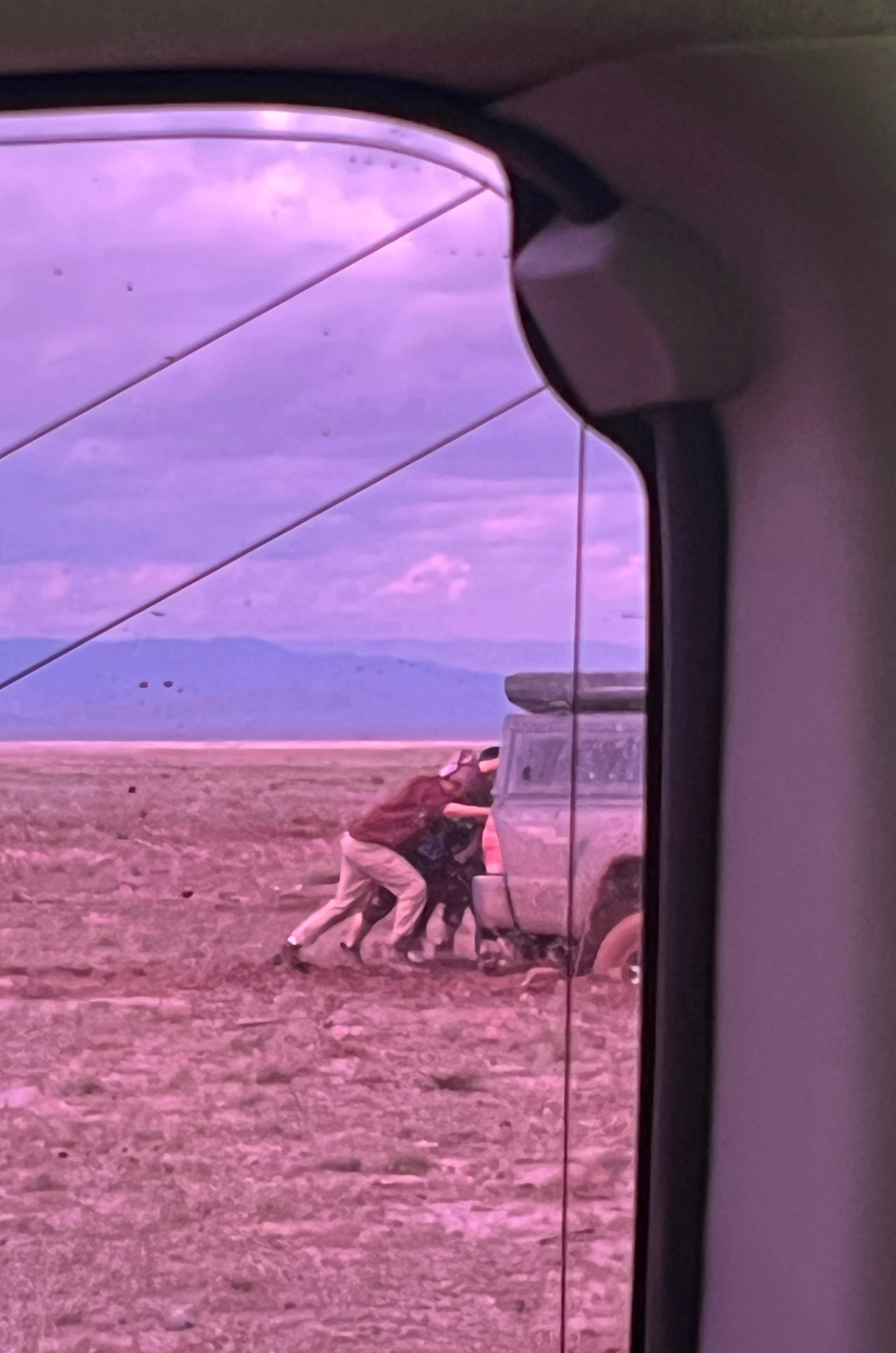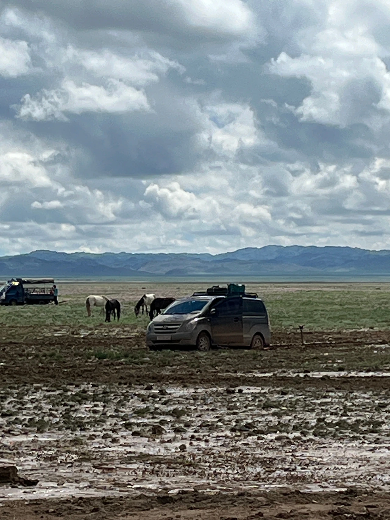 그런데... 또 사건이 터졌다. 고비를 벗어나는 과정에서 우리 스타렉스의 바퀴가 진흙에 빠졌다. 역시나 전날 내렸던 홍수가 그 원인이었다. 설상가상으로 우리를 구하려고 왔던 투어사의 추가 차량도 같이 바퀴가 빠졌다. 힘센 몽골의 성인 남자 여럿이 붙어서 아무리 밀어도 소용이 없었다.
