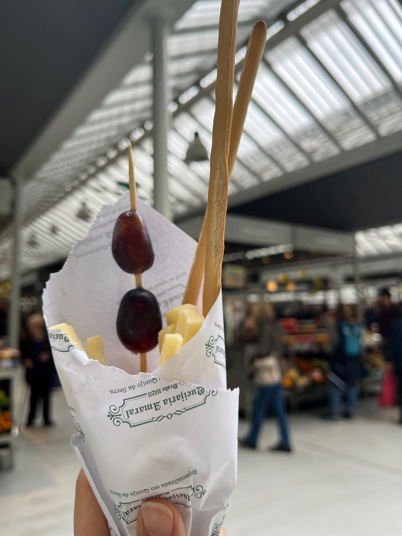 무언가 하나를 사고 싶었던 나는 열심히 두리번거리던 중 사람들이 많이 모여있는 한 치즈가게를 발견했다. 치즈의 꼬린내가 물씬 풍겨오는 곳에서 5유로짜리 간식거리를 샀는데 치즈와 과일, 과자가 같이 들어있었다. 토마토가 들어간 치즈도 꽤 맛있었는데 먹자마자 와인이 생각나는 딱, 와인 안주였다!