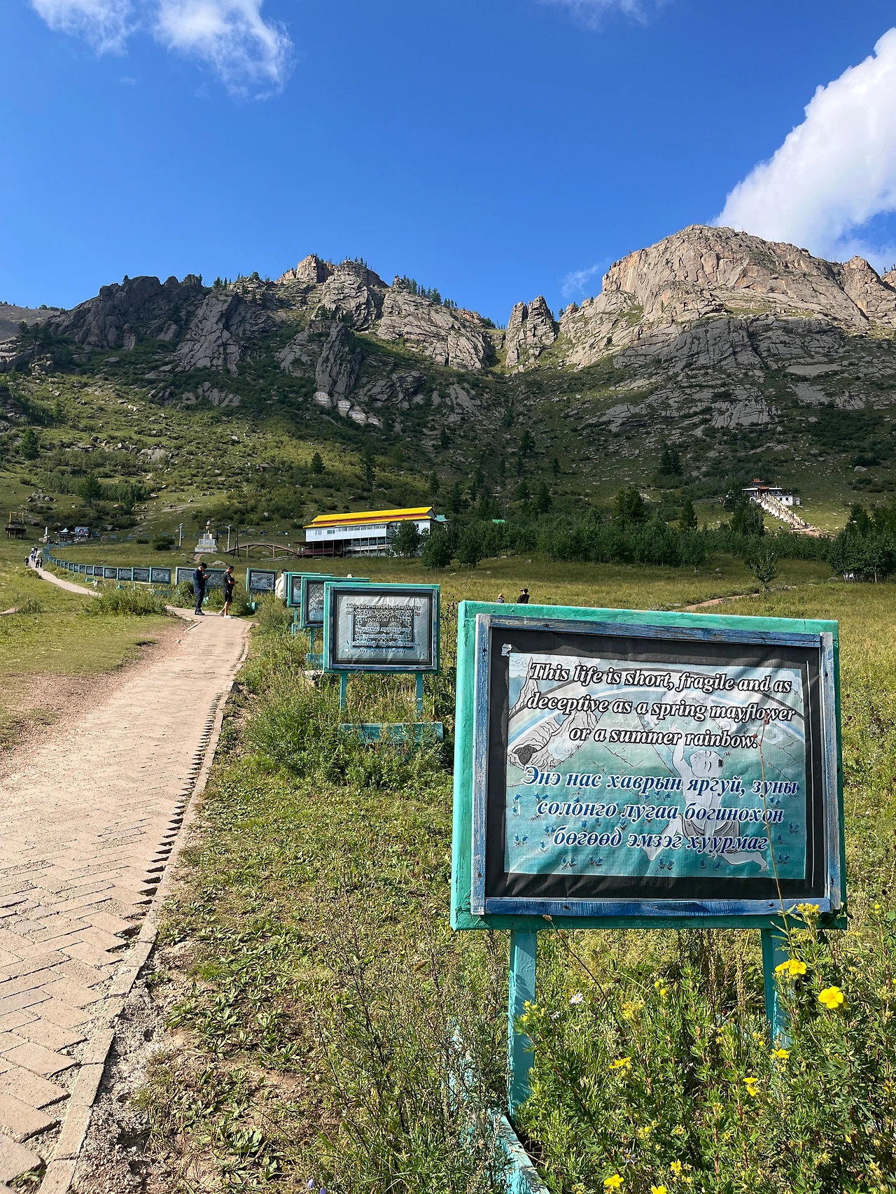 다음으로 향한 마지막 관광명소는 '아리야발 사원'. 사실 몽골인의 상당수는 무교인데, 그나마 주된 종교는 불교이다. 사원에 가기 위해서 주차장에서부터 약 30분 이상 걸어서 올라가야 하는데, 명언이 적힌 엄청나게 많은 팻말이 오르막을 따라 서있다. 영어로도 적혀있어서 읽어가며 올라가는 재미가 있다. (물론 반대편에도 다른 명언이 적혀있어서 내리막길을 내려올 때는 다른 명언을 볼 수 있다.)