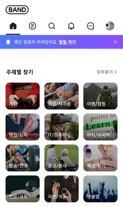 네이버 밴드 마케팅을 위해 먼저 알아야 할 것이 있습니다. 일단 첫 번째로는 네이버 밴드가 관심사를 기반으로 하고 있다는 점입니다. 취미, 문화/예술, 경제/재테크, 어학/외국어 등과 같은 주제를 공유할 수 있죠.