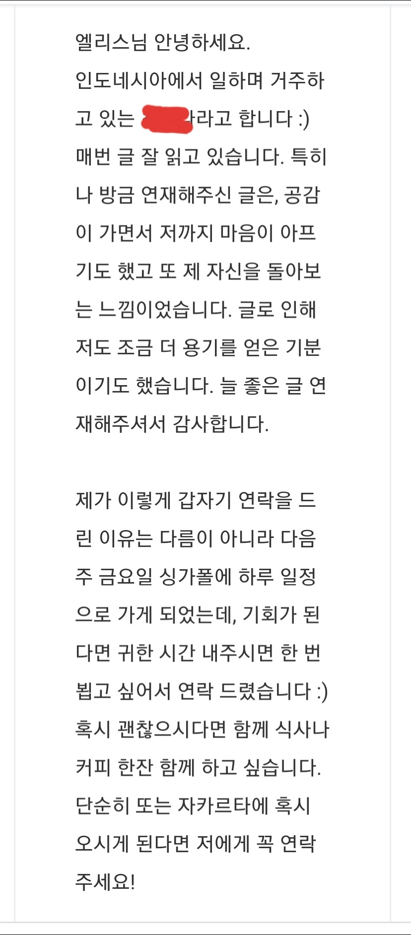 인도네시아에서 싱가포르에 1일 출장을 가게 되었다는 것을 알았을 때, 평소 팬이었던 작가가 싱가포르에 거주한다는 것을 기억하고 귀신에 홀린 듯 용기를 내어 메일을 한통 보냈다.