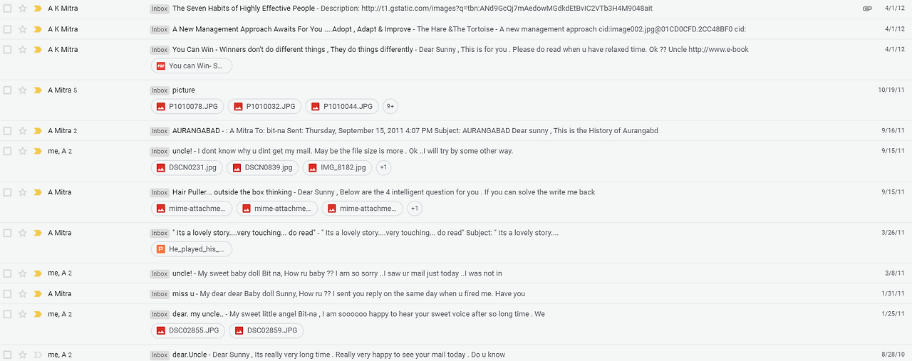 영어를 잘 못했던 나임에도 불구하고, 소통하기 위해 번역기를 돌려가며 이메일을 썼다. 내게 좋은 글귀가 있으면 늘 보내주셨고 근황을 위해 가족들의 사진도 보내주셨다. 그렇게 2008년에 시작된 인연은, 계속되었고 2009년 내가 한국에서 고등학교 자퇴를 하고 인도로 고등학교로 갈 때 그분께 내가 인도로 돌아가게 되었다고 말씀드리자 너무 기뻐하셨다. 다만 그때 나는 북인도 뉴델리에서 3시간이나 떨어진 먼 곳에 있었고, 그분은 서인도 아우랑가바드에 계셨기에 뵐 수는 없었지만 매번 도움이 필요할 때마다 어떻게든 나를 도와주셨다. 그렇게 시간이 흘러 연락이 잘 닿지 않을 때도 많았지만 아빠는 나를 기다려주셨고, 늘 먼저 연락을 해주셨다. 언제든 힘이 들거나 도움이 필요하면 연락하라며 나를 막내딸이라고 불러주셨는데 19살에서 20살이 되던 그 무렵 아빠를 뵈러 다시 아우랑가바드에 갔다.