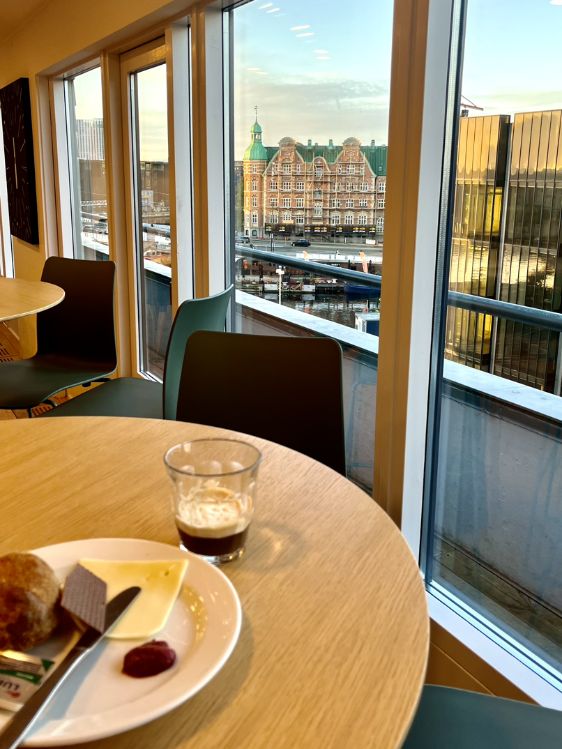 그렇게 나의 매니저와의 면담이 끝나고 배가 고파서 구내식당으로 올라갔다. 점심엔 사람이 너무 많아서 풍경을 잘 보지 못했는데, 아침에 가니까 2-3명의 직원만 식사를 하고 있어서 텅텅 비어있었고, 아주 아름다운 코펜하겐 풍경을 볼 수 있었다. 여름에 주야장천 갔던 Kayak Bar가 바로 보이는 풍경이다.