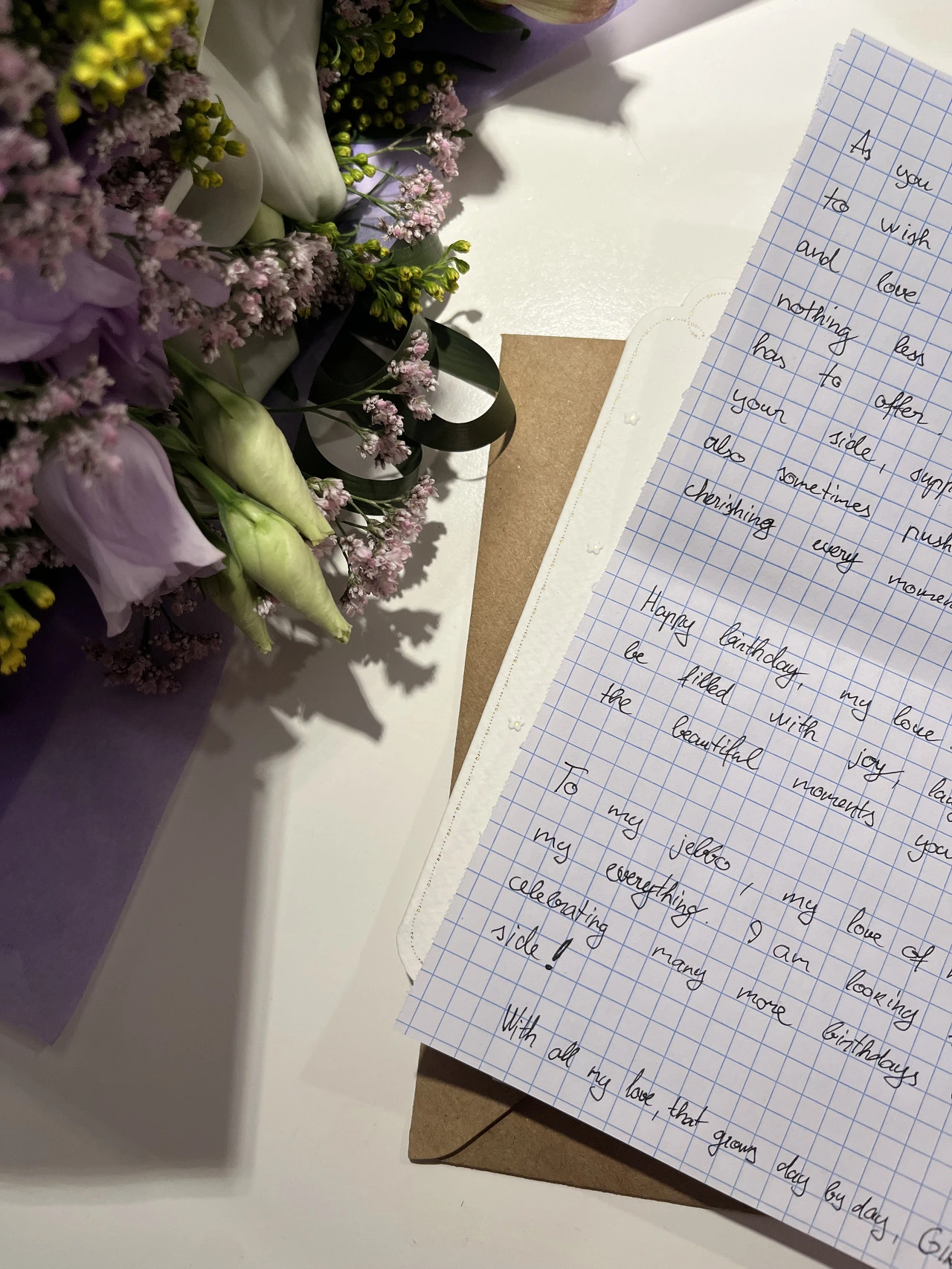 오늘은 나의 생일이다. 감기기운이 있어 어제 일찍 잠이 들었다. 그래서 새벽 일찍 6시쯤 눈이 떠졌는데, 침대 옆에 꽃과 편지가 놓여있었다. 설마 남편이 준 건가 싶어 조용히 들고 주방으로 나왔다. 그리고 편지를 펼쳤는데 무려 4장의 손 편지가 있었다. 글씨체가 너무 예뻐서 이거 혹시 내 친구 중 한 명이 남편한테 부탁한 건가 싶어 맨 뒷장부터 살펴보니 남편이 쓴 거였다. 세상 놀라 첫 줄을 읽는데 눈물이 줄줄 흐르기 시작했다. 남들은 별거 아닌 서프라이즈일 수 있지만 내게는 조금 많이 특별하고 남다를 수밖에 없기 때문이다.