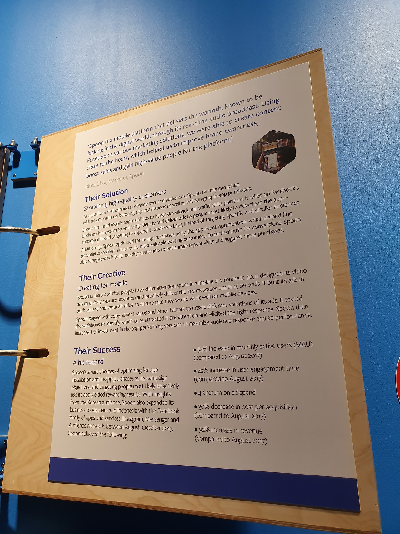 2018년 채택되었던 스푼 라디오 페이스북 마케팅 성공사례가 벽에 떡하니 걸려 있는 것이 아닌가? 많은 성공사례 중에 한국 대표 중 한 곳으로 우리(스푼) 사례가 채택되었다고 한다. 그리고 무엇보다 나의 이름 석자가 영문으로 함께 걸려 있는데, 어찌나 감격스럽던지. 내가 사랑하고, 내가 열정 쏟은 서비스의 이름이 외 딴 나라 싱가포르에 걸려있다니.. 눈물이 날 뻔했다.