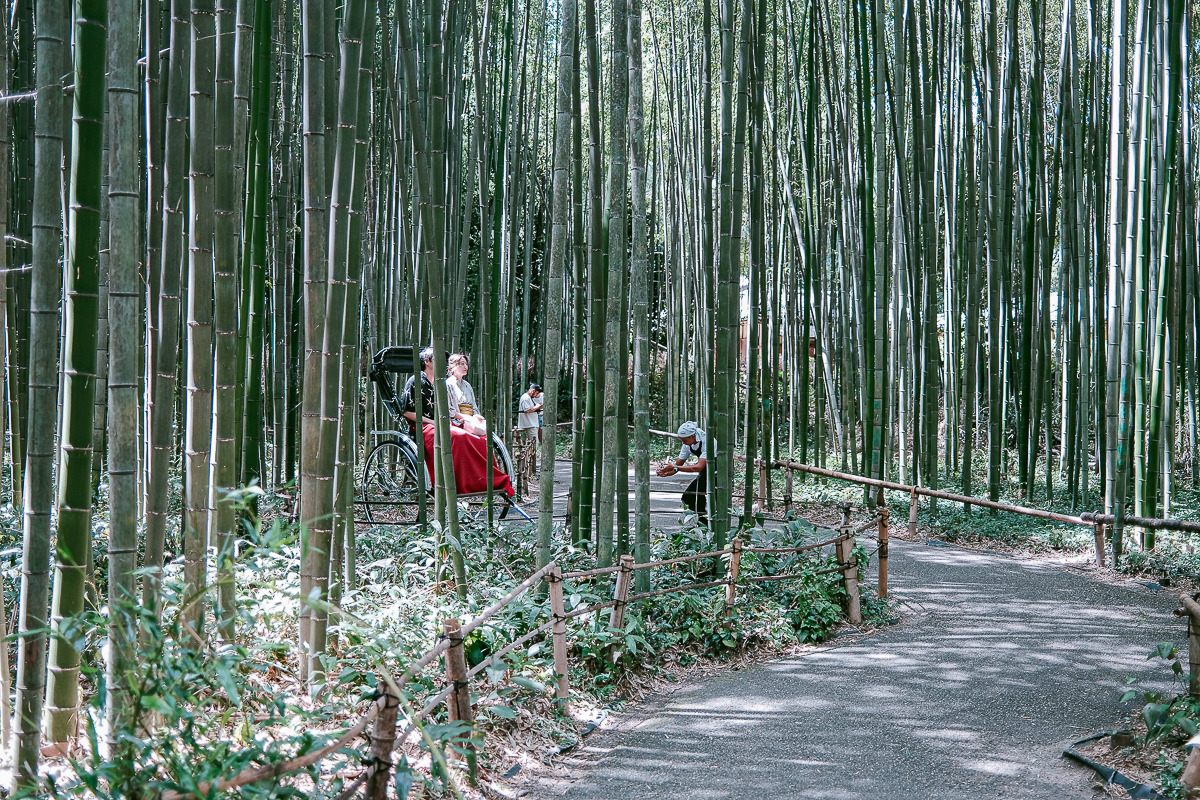 이 사진을 찍은 곳은 치쿠린이라는 대나무 숲이었는데 이 대나무 숲은 인력거와 사람이 걸을 수 있는 길을 구분하여 많은 인파와 인력거가 뒤섞이지 않도록, 그리고 인력거를 운전하는 인력거꾼과 그 인력거에 탄 관광객들을 온전히 배려하고 있다는 느낌을 받을 수 있는 곳이었다. 그리고 아마도 인력거를 탄 고객들을 대상으로 하는 포토스팟이 있었던 것 같았는데 그 포토스팟 중 한 곳에서 사진을 찍고 있는 인력거꾼과 관광객들의 모습을 보고서는 사진에 담지 않을 수 없었다. 최대한 내가 찍은 사진에 그 분위기와 그들의 태도를 담고 싶었는데 커플로 보이는 관광객들은 정말 너무나도 행복한 웃음을 보이고 있었고 그들을 이끄는 인력거꾼 또한 그 커플 못지않은 행복한 웃음을 보이고 있었다. 누가 손님인지 모를 정도로 그들 모두의 모습이 너무나 행복해 보였고 좋은 사진을 찍어주기 위해 이곳저곳 구도를 위해 움직이는 인력거꾼의 모습은 마치 리듬감이 느껴지는 것 같은 착각이 느껴질 정도로 에너지가 있었고 살아있다는 느낌이었다. 마치 동일한 상황에서 지구보다 1.5배 정도 더 행복감을 느끼는 사람들이 거주하는 또 다른 차원의 행성에 온 것 같은 이질감까지 들었던 것 같다.