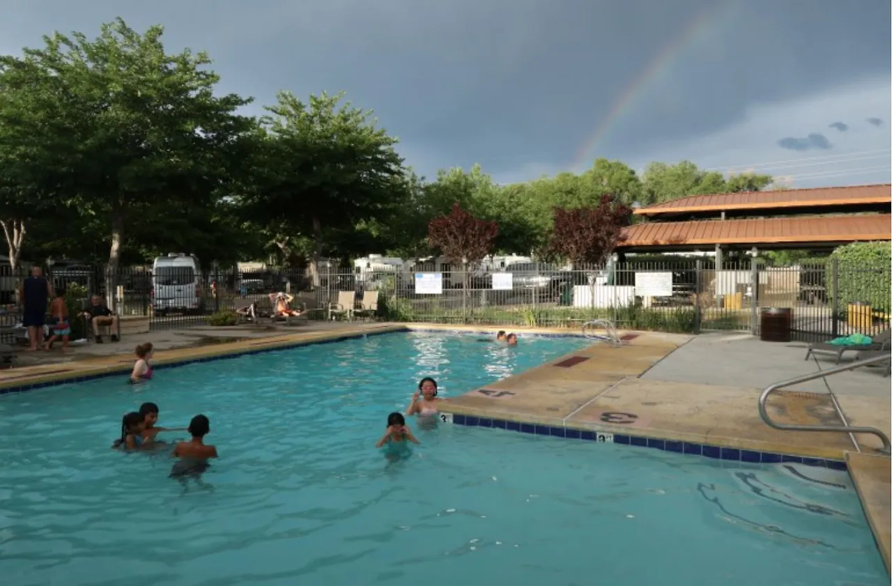 아이들은 역시 수영장만 있으면오케이 입니다 수영장 뒤로 무지개 보이시나요?