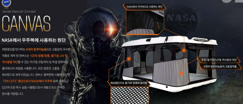 공식 사이트에서의 설명을 빌리면 100%방풍, UV 및 직사광선 차단, 물이 스며들지도, 들어올 수도 없는 손으로 찢을 수 없는 NASA에서 우주복에 사용하는 6개의 알루미늄층으로 구성된 ‘TEN CATE’ 원단이란다. 뭔가. 우주대폭발이 일어나면 우리 루프탑에 들어가면 될거 같은 느낌이다.