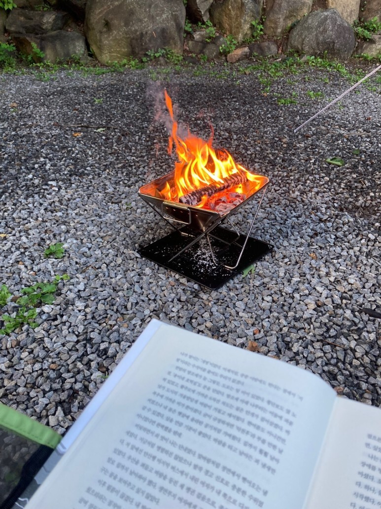 항상 와이프는 캠핑을 가면 1캠핑1책을 한다. ... 가만히 앉아서.. 불은 내가 피우고..