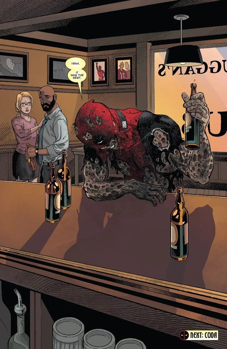 2. 데드풀의 웨이드 윌슨은 자신의 온몸에 퍼진 암을 치료하기 위한 실험에 참여했다가 엄청난 고통으로 인해 온몸이 흉측하게 일그러져 사랑마저 포기하게 되지만, 결국 슈퍼 히어로의 힘을 얻는다.