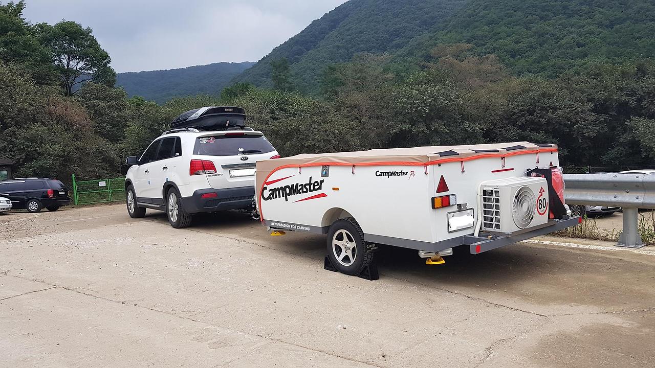 캠핑시에는 차 뒤에 연결하여 끌고 다녀야 하며 안전을 위해서 고속운전은 위험하다.