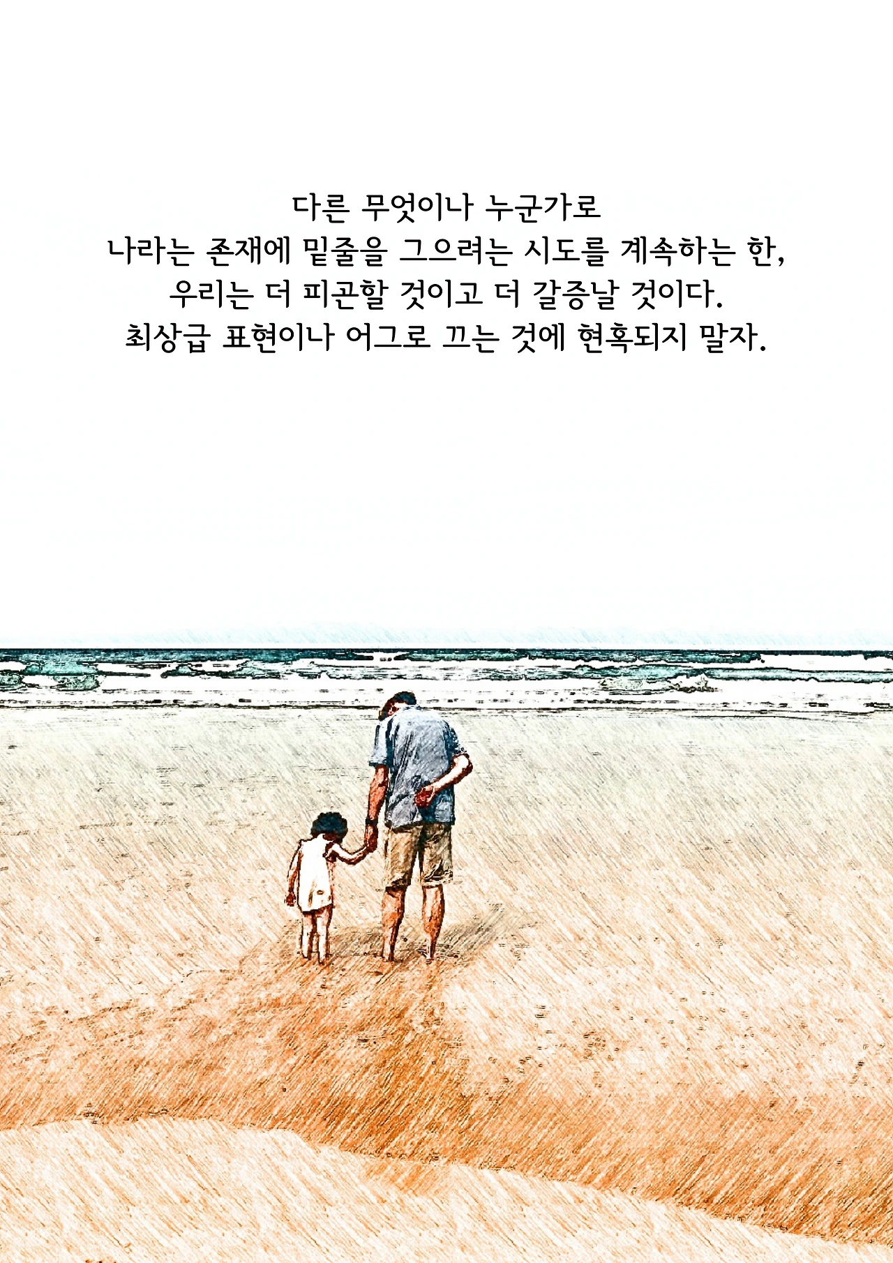 신조어 가운데 '어그로 끌다!'는 말이 있다. 사람들의 관심이나 주목을 끌기 위해서, 평소보다 자극적인 언행을 일삼는 경우를 가리킨다. 이런 관점에서 최상급 표현을 남발하는 것도, '어그로 끌기 위한' 하나의 수단일지 모른다. 오늘날 '~한 사람처럼' 보이려고 애쓰는 노력이, 우리를 더 피곤하게 만들고 갈증나게 하는 것 같다. 다른 무엇이나 누군가로 나라는 존재에 밑줄을 그으려는 시도를 계속하는 한, 우리는 더 피곤할 것이고 더 갈증날 것이다. 최상급 표현이나 어그로 끄는 것에 현혹되지 말자.