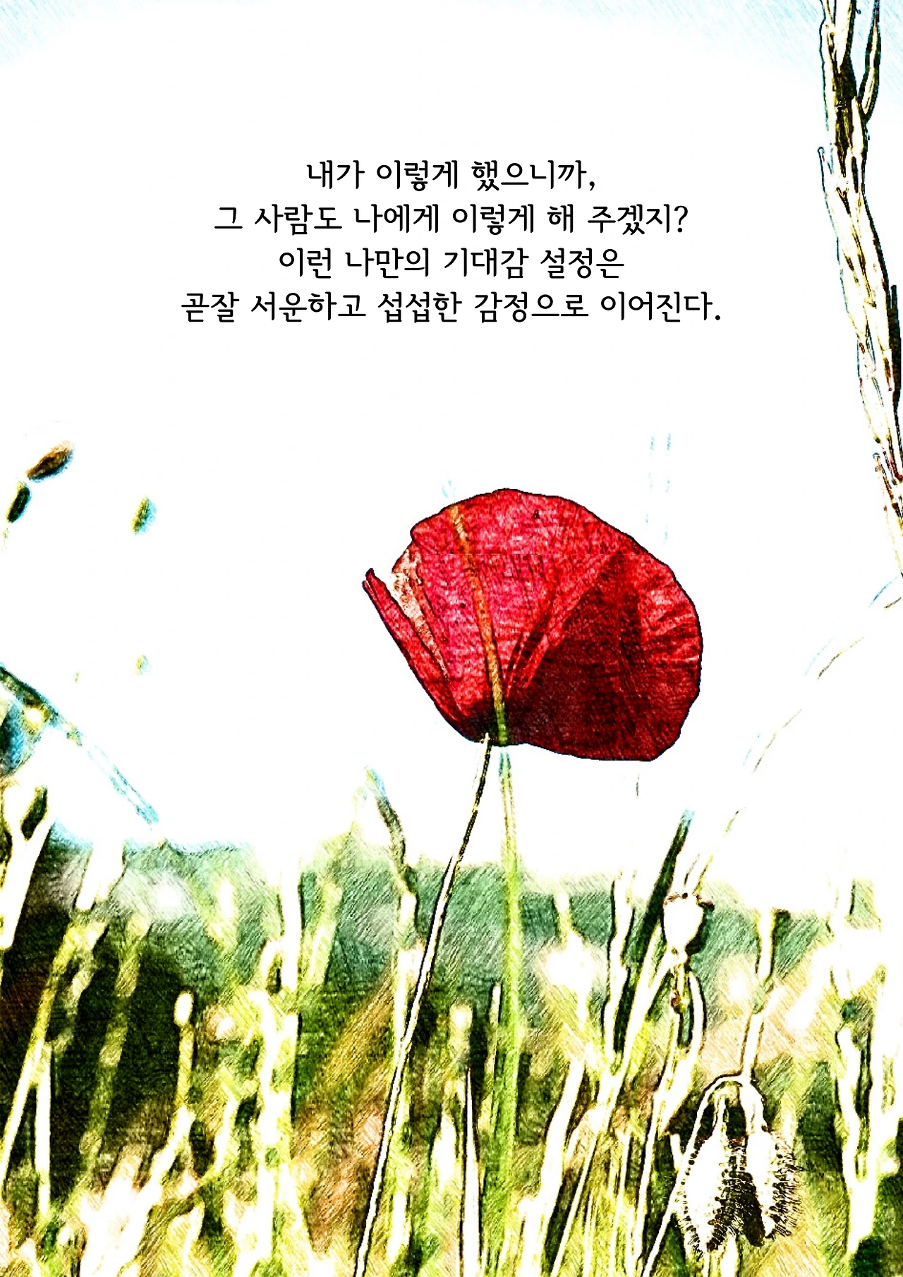 좋은 일을 하고 나서 그 결과로 좋은 반응을 기대하는 건 당연하지만, 문제는 그 기대의 대부분이 나 혼자 꿈꾸고 상상한 반응이라는데 있다. '내가 이렇게 했으니까, 그 사람도 나에게 이렇게 해 주겠지?' 이런 나만의 기대감 설정은 곧잘 서운하고 섭섭한 감정으로 이어진다. 우리는 상대가 항상 내가 원하는 타이밍에 내가 원하는 방식으로 반응하기를 기대한다. 그러나 그 기대가 충족되는 일은 그리 많지 않다.