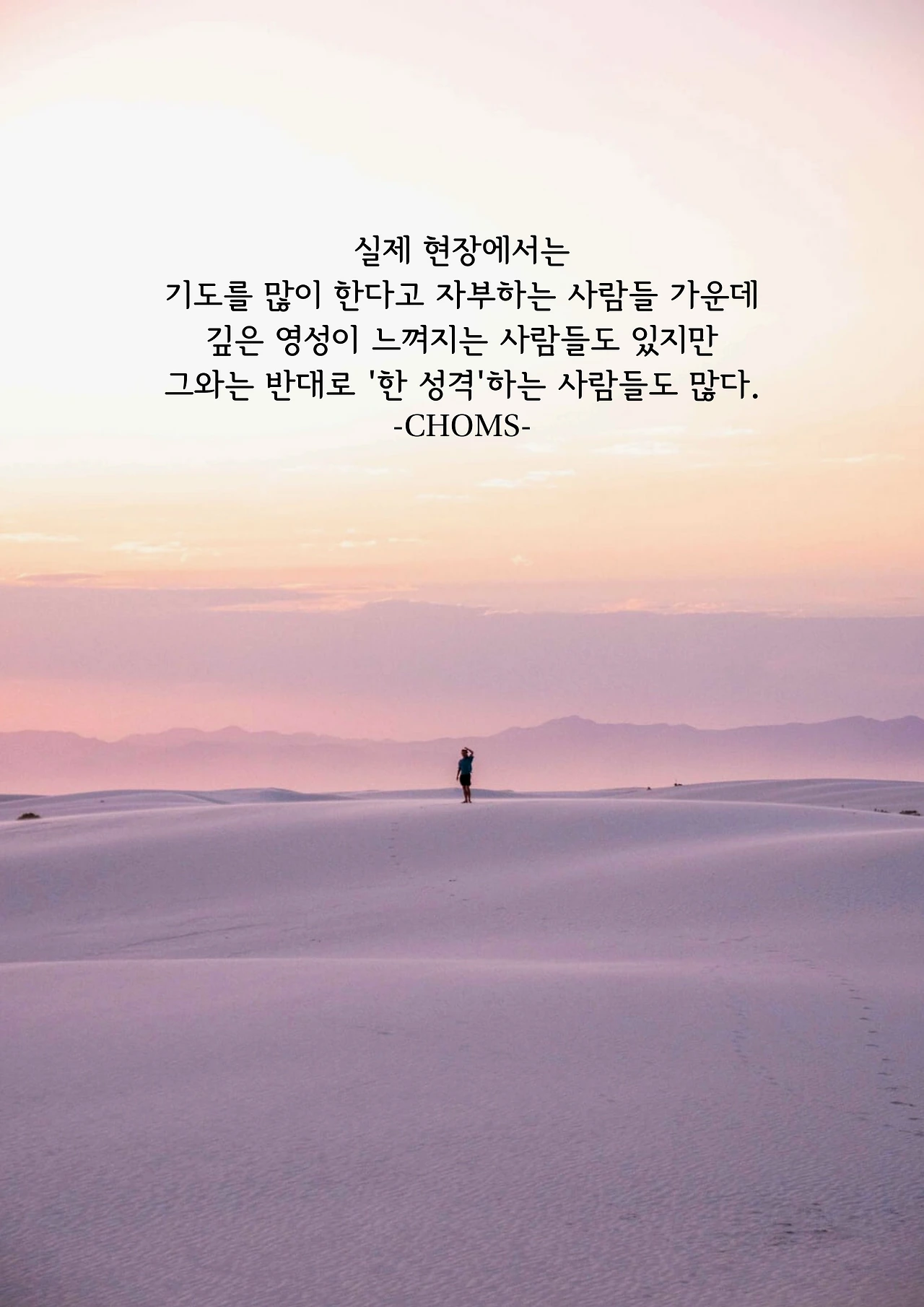 기도를 많이 하는 사람이 깊은 영성의 소유자라고 하는 데에는 이의가 없다. 그런데 실제 현장에서는 기도를 많이 한다고 자부하는 사람들 가운데 깊은 영성이 느껴지는 사람들도 있지만, 그와는 반대로 '한 성격'하는 사람들도 많은 게 사실이다. 성령 충만한 사람 못지않게 혈기 충만한 사람도 많다는 것이다.