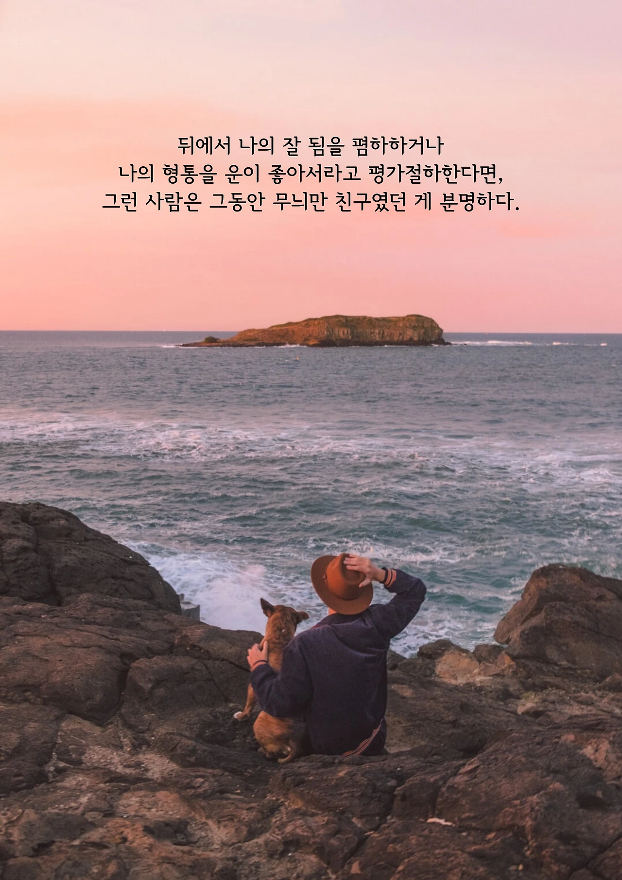 이걸 감안한다면, 진짜 나를 사랑하고 아끼는 사람을 구별하는 방법은 의외로 쉽고 간단하다. '나의 잘됨을 마치 자기 일처럼 기뻐하고 주변에도 나에 대해 호평하는지'를 보면 알 수 있기 때문이다. 하지만 뒤에서 나의 잘 됨을 폄하하거나 나의 형통을 운이 좋아서라고 평가절하한다면, 그런 사람은 그동안 무늬만 친구였던 게 분명하다.