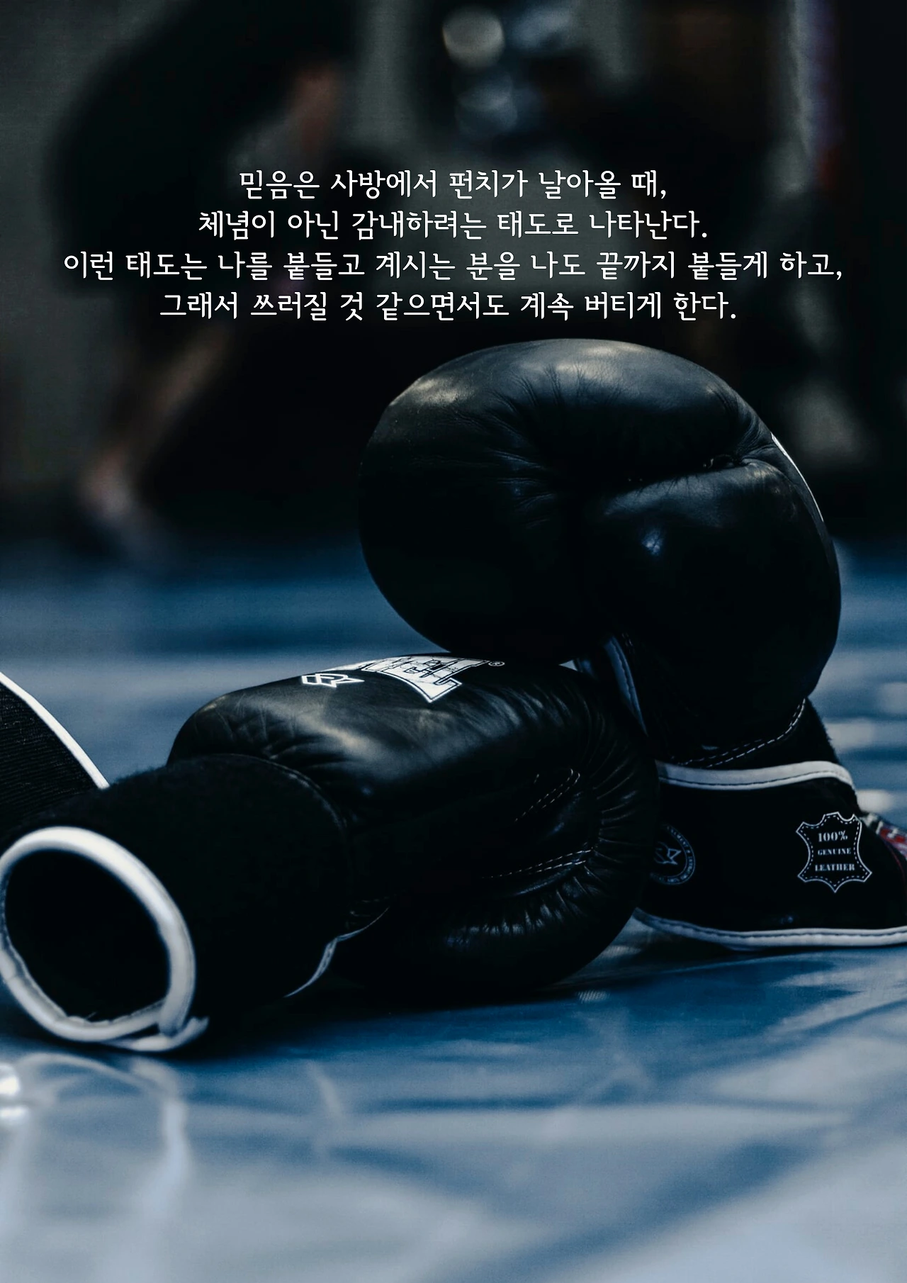 그렇다면 우리와 세상 사람들 사이에 무슨 차이가 있을까? 나는 그 차이가 믿음의 여정으로 받아들이느냐 아니면 운명으로 받아들이느냐에 있다고 생각한다. 믿음은 사방에서 펀치가 날아올 때, 체념이 아닌 감내하려는 태도로 나타난다. 이런 태도는 나를 붙들고 계시는 분을 나도 끝까지 붙들게 하고, 그래서 쓰러질 것 같으면서도 계속 버티게 한다.