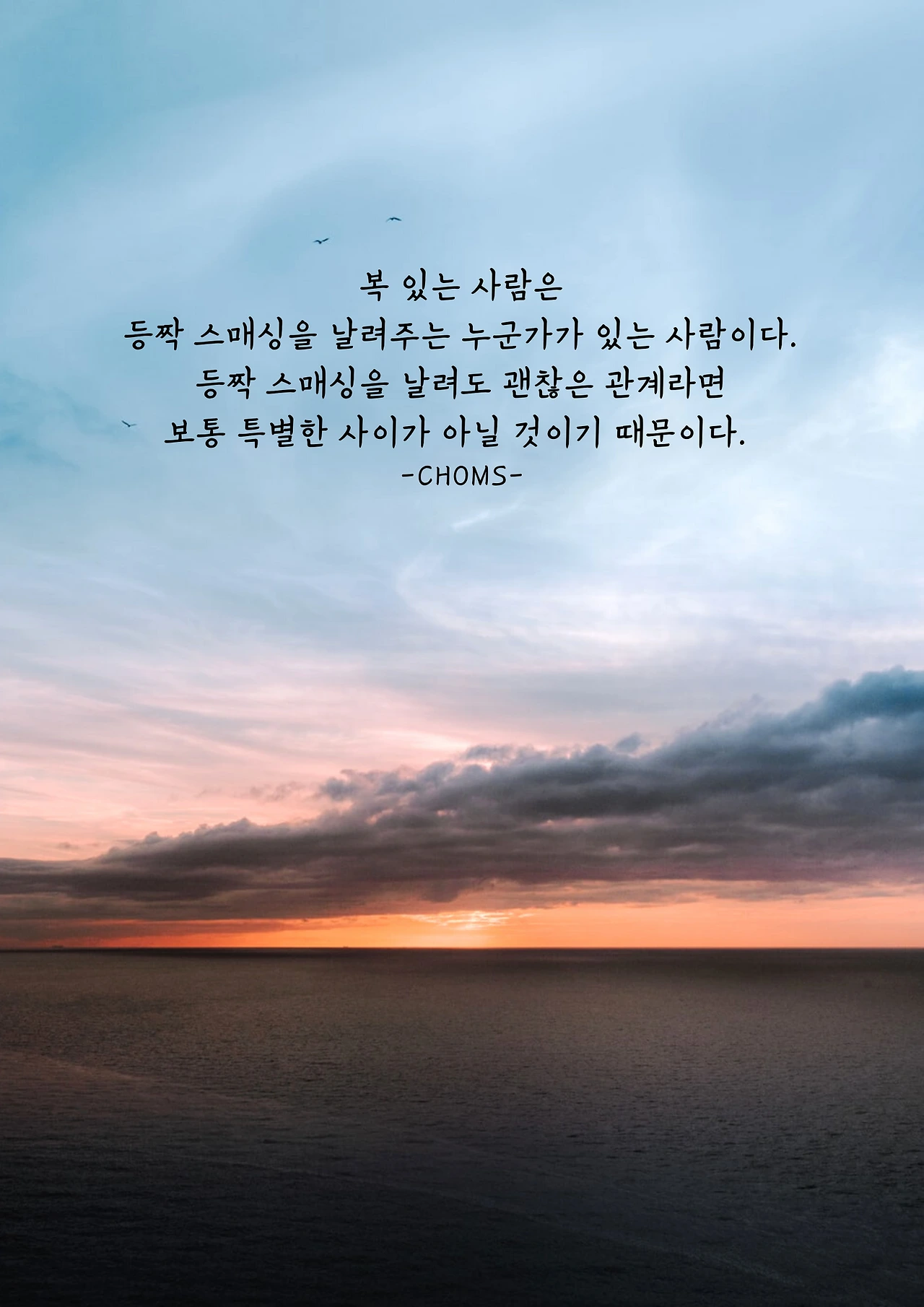 하나님의 사랑은 죄를 봐주는 것에 있지 않다. 불순종을 보고도 모른 척 눈 감아 주는 것에 있지도 않다. 길이 참으시면서도 거역과 불순종을 용인하지 않는 것이 그분의 사랑이다. 하지만 요즘은 누가 잘못을 해도 그냥 모른 척한다. 꼰대로 불리기 싫어서 다들 쉬쉬하는 분위기다. 이런 세상에 등짝 스매싱을 날려주는 사람이 곁에 한두 명 있다는 건 얼마나 감사한 일일까 하고 생각해 본다. 복 있는 사람은 등짝 스매싱을 날려주는 누군가가 있는 사람이다. 엄마의 마음과 하나님의 사랑으로 말이다. 등짝 스매싱을 날려도 괜찮은 관계라면 보통 특별한 사이가 아닐 것이기 때문이다. 다른 부위는 몰라도 적어도 등짝에 날리는 스매싱은 사랑이다.