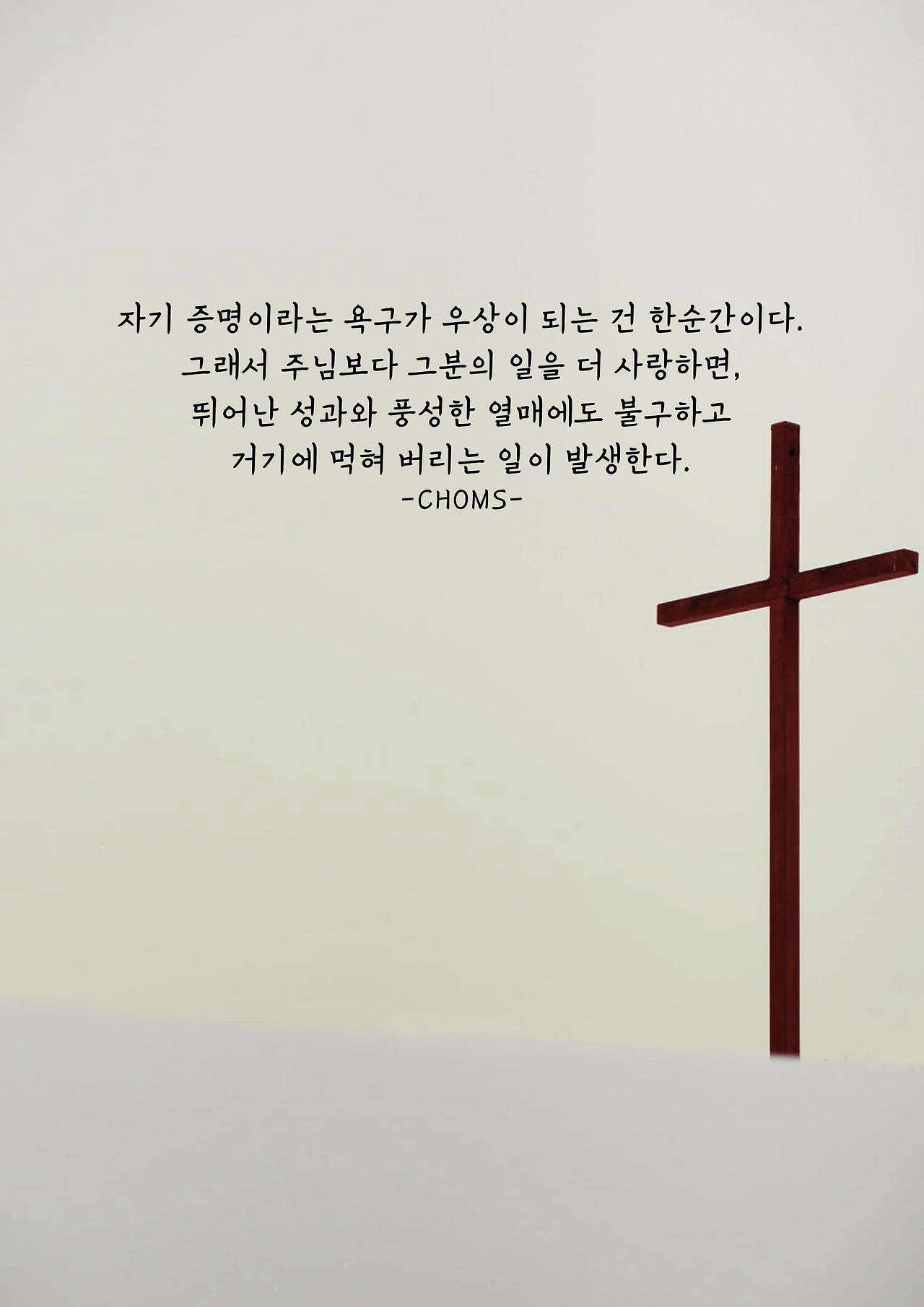 어디 간증뿐일까? 사역에 삼켜버리고, 목회에 삼켜버리고, 열매에 삼켜버리고, 프로그램에 삼켜버리고, 봉사에 삼켜버리고. 눈에 띄는 성과를 내고 열매까지 풍성하면, 더 쉽고 빠르게 삼켜버린다. 자기 증명이라는 욕구가 우상이 되는 건 한순간이다. 그래서 주님보다 그분의 일을 더 사랑하면, 뛰어난 성과와 풍성한 열매에도 불구하고 거기에 먹혀버리는 일이 발생한다. 작은 녹이 결국에는 쇠를 전부 삼켜버린다고 했다. 대수롭지 않게 생각했던 ‘조금’을 방치한 결과다. 옛날 로마에서는 원정에서 승리를 거두고 개선하는 장군이 시가행진을 할 때, 노예를 시켜 큰소리로 ‘메멘토 모리(Memento Mori)’를 외치게 했다. ‘너도 반드시 죽는다는 걸 기억하라!’는 뜻으로, 승리에 삼켜버리지 않도록 도와주는 일종의 견제 장치였다. 여기에서 예외인 사람은 없기에, 나의 열심에도 결국에는 하나님의 열심이 이루신다는 걸 늘 되새김질하려고 한다. ‘하나님의 열심이 이루신다!’는 고백이 ‘나의 열심’에 삼켜버리지 않도록 막아주기를 기대하면서 말이다.