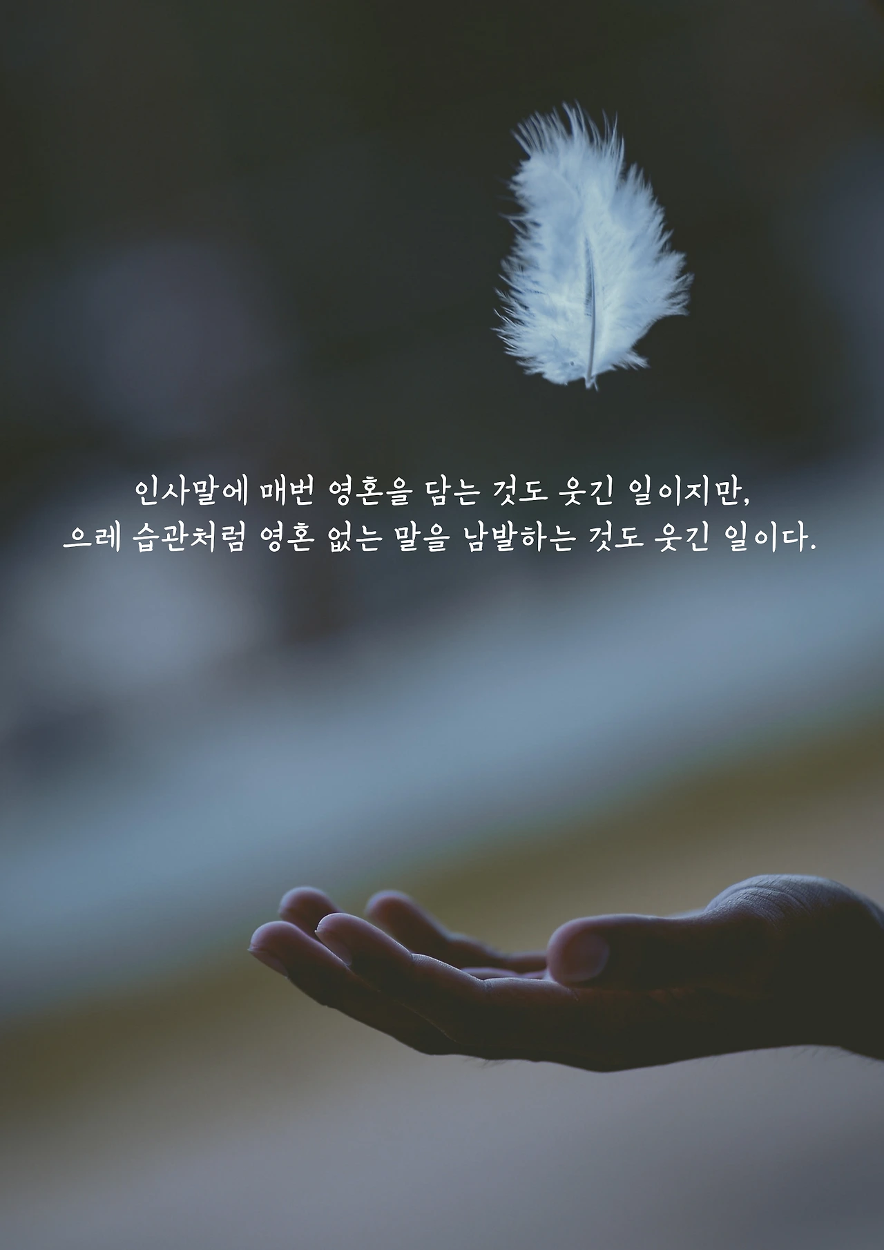 2. 따뜻한 듯 차가운 말 '요즘 어떻게 지내요? 괜찮아요? 많이 힘들죠?' 듣기만 해도 가슴이 따뜻해지는 말이다. 자기밖에 모르고, 자기가 세상에서 제일 힘들다고 생각하는 시대에, 이런 따뜻한 말들은 마치 오아시스를 만난 것처럼 반갑다. 이런 부류의 말들은 서로의 거리를 바짝 당겨주는 것 같아서 좋다. 하지만 예의상 건네는 말, 기계적으로 건네는 말이라면 얘기는 다르다. 인사말에 매번 영혼을 담는 것도 웃긴 일이지만, 으레 습관처럼 영혼 없는 말을 남발하는 것도 웃긴 일이다. 영혼이 담긴다는 건, 마음 그중에서도 진심이 담긴다는 뜻일 것이다.