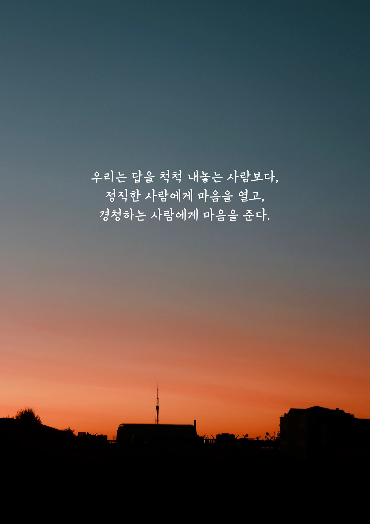 나 또한 초신자 때, 질문이 많았다. 내 질문에 척척 대답해 준 분도 있었지만, '그건 저도 잘 모르겠네요!'라고 대답한 분도 있었다. 대답하지 못했다는 이유로, 얕보거나 깔본 적은 없었다. 오히려 솔직한 모습에 더 믿음이 갔다. (물론 다시 만날 땐, 질문에 대한 답변을 준비해 왔다) 내 질문을 흘려듣지 않고, 대답을 준비해 온 사람이 싫을 수 있을까? 내 질문을 소중하게 생각한다는 건, 곧 나를 소중하게 생각한다는 걸 의미한다. 우리는 답을 척척 내놓는 사람보다, 정직한 사람에게 마음을 열고, 경청하는 사람에게 마음을 준다.