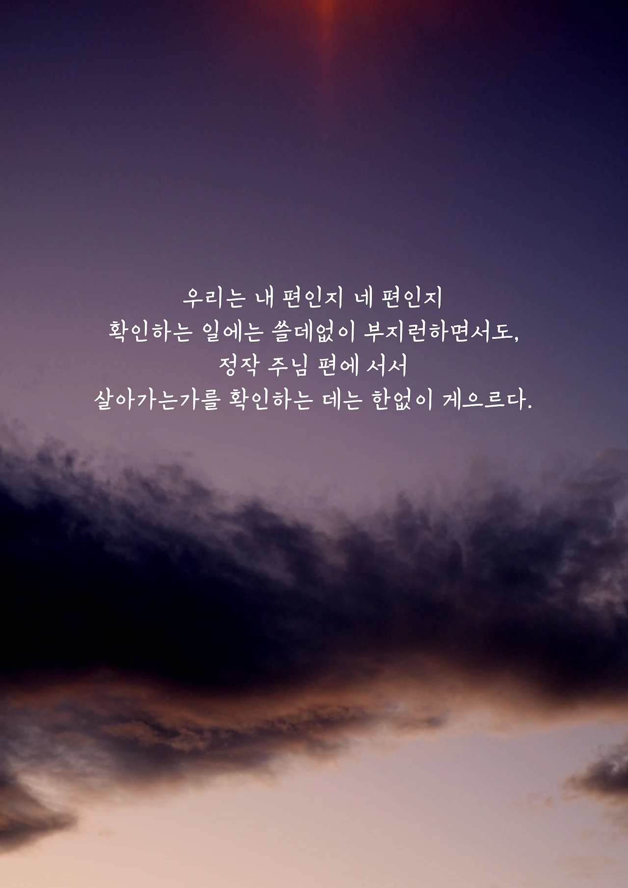 어디를 가나 편 가르기를 좋아하고 주도하는 사람들이 있다. 그들은 내 편이 되면 혜택을 보겠지만, 만약 그렇지 않으면 쓴맛을 볼 거라고 말한다. 마음이 맞아서 한 편이 되는 거라면 모를까, 나를 따르지 않으면 '국물도 없어!'라고 하는 건 서로 피곤해지는 일이다. 매사에 아군과 적군으로 잘 나누는 사람은 주로 힘 있는 사람이거나 그 측근인 경우가 많다. 그들은 유력한 사람과의 친분을 과시하면서 존재감을 드러내는 걸 좋아한다. '나 OO와 친해. 그분과 나는 특별한 사이야!' 이 말에는, '나에게 밉보이면 앞으로 피곤할 거야!'라는 뼈가 들어있다. 우리는 내 편인지 네 편인지 확인하는 일에는 쓸데없이 부지런하면서도, 정작 주님 편에 서서 살아가는가를 확인하는 데는 한없이 게으르다. 쓸데없는 일로, 쓸데없이 피곤하게 사는 것도 가지가지다.