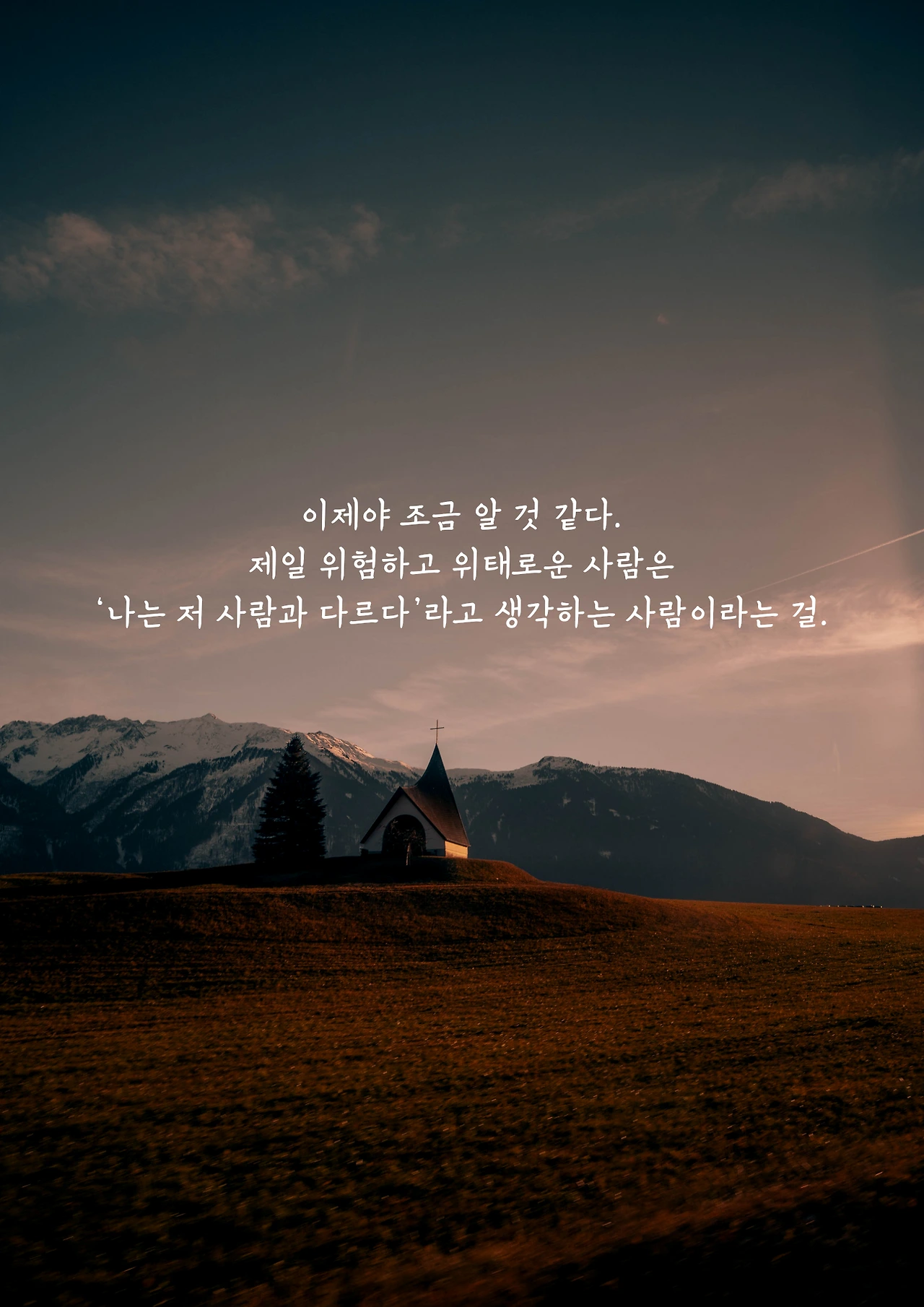 나쁜 상황에서도 좋은 것만 배우는 사람이 있는가 하면, 좋은 상황에서조차 꼭 못 된 것만 골라서 배우는 사람이 있다. 우리의 마음은 보고 배운 것으로 물든다. 좋은 쪽으로든, 나쁜 쪽으로든 말이다. 그렇기 때문에 ‘어떤 사건’이 일어났을 때 어떤 태도로 반응할 것인가 하는 문제는 매우 중요하다. 타락과 변질은 ‘간발의 차이’로 나뉠 때가 많기 때문이다. 아니, 어쩌면 깻잎 한 장 차이일지도 모른다. 예수님의 열두 제자 중에서 순교자와 배교자가 동시에 나온 걸 보면, 누가 ‘나는 아니지요?’라고 자신만만하게 대답할 수 있을까! 여담이지만, ‘나는 절대 그럴 리 없다!’라고 호언장담했던 베드로도 보기 좋게 넘어졌다. 나도 그 사람일 수 있음을, 그도 나였을 수 있음을 생각하니 섬뜩하다. 이제야 조금 알 것 같다. 제일 위험하고 위태로운 사람은 ‘나는 저 사람과 다르다’라고 생각하는 사람이라는 걸. 그리고 ‘나도 별수 없는 인간’일 수 있다는 자세로 살아가는 사람이, 그나마 희망이 있는 사람이라는 것도 말이다.