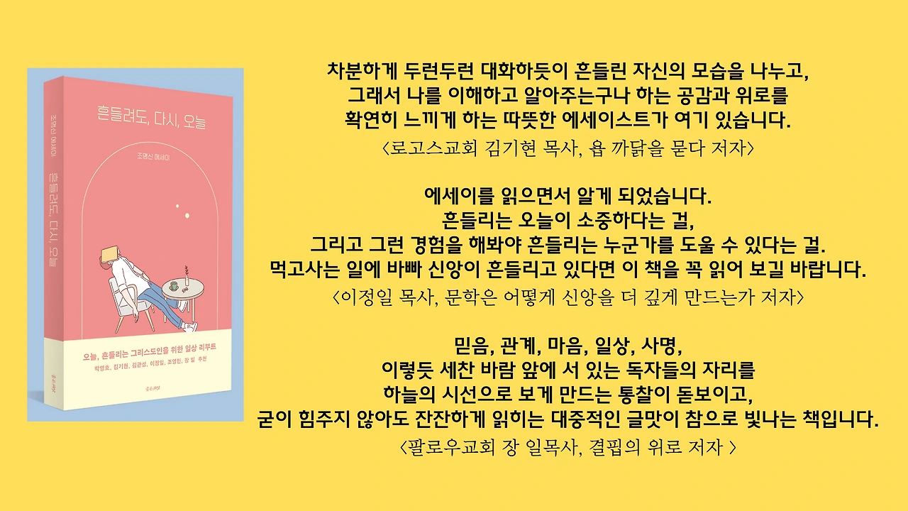 예수님을 믿는다고 해서 하루아침에 걱정 근심이 사라지고, 확신과 담대함 속에서 사는 건 아니다. 그래서일까? 그리스도인도 마음속 어딘가를 두드려 보면, 왠지 모르게 슬프고 아픈 구석이 있는 것 같다. 우리는 한 번도 살아본 적 없는 오늘을 살아야 한다. 이 말은 예수님을 주님으로 믿어도, 세상 사람들처럼 두렵고 떨리기는 마찬가지라는 뜻이다. 이 책에는 내가 우여곡절 끝에 예수님을 믿고 목회자로 살기까지 그동안 흔들렸던 많은 순간이 담겨 있다. 하나님의 시선으로 '다시보기' 했던 순간들이, 어느새 내 삶의 든든한 버팀목이 되어 있었다...