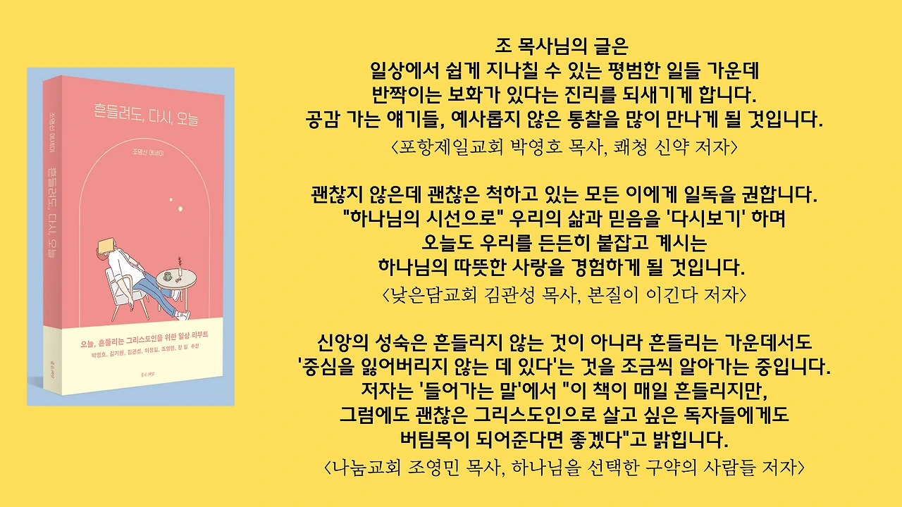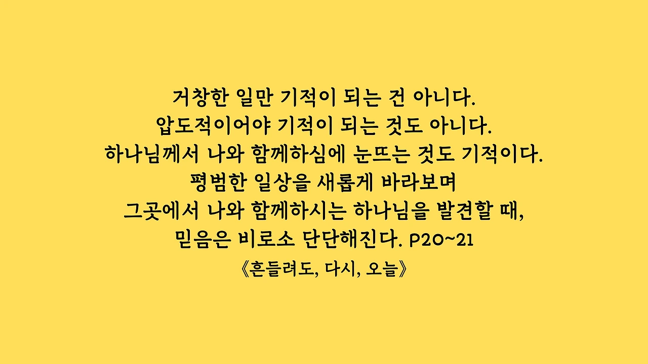 거창한 일만 기적이 되는 건 아니다. 압도적이어야 기적이 되는 것도 아니다. 하나님께서 나와 함께하심에 눈뜨는 것도 기적이다. 평범한 일상을 새롭게 바라보며 그곳에서 나와 함께하시는 하나님을 발견할 때, 믿음은 비로소 단단해진다. (20-21)